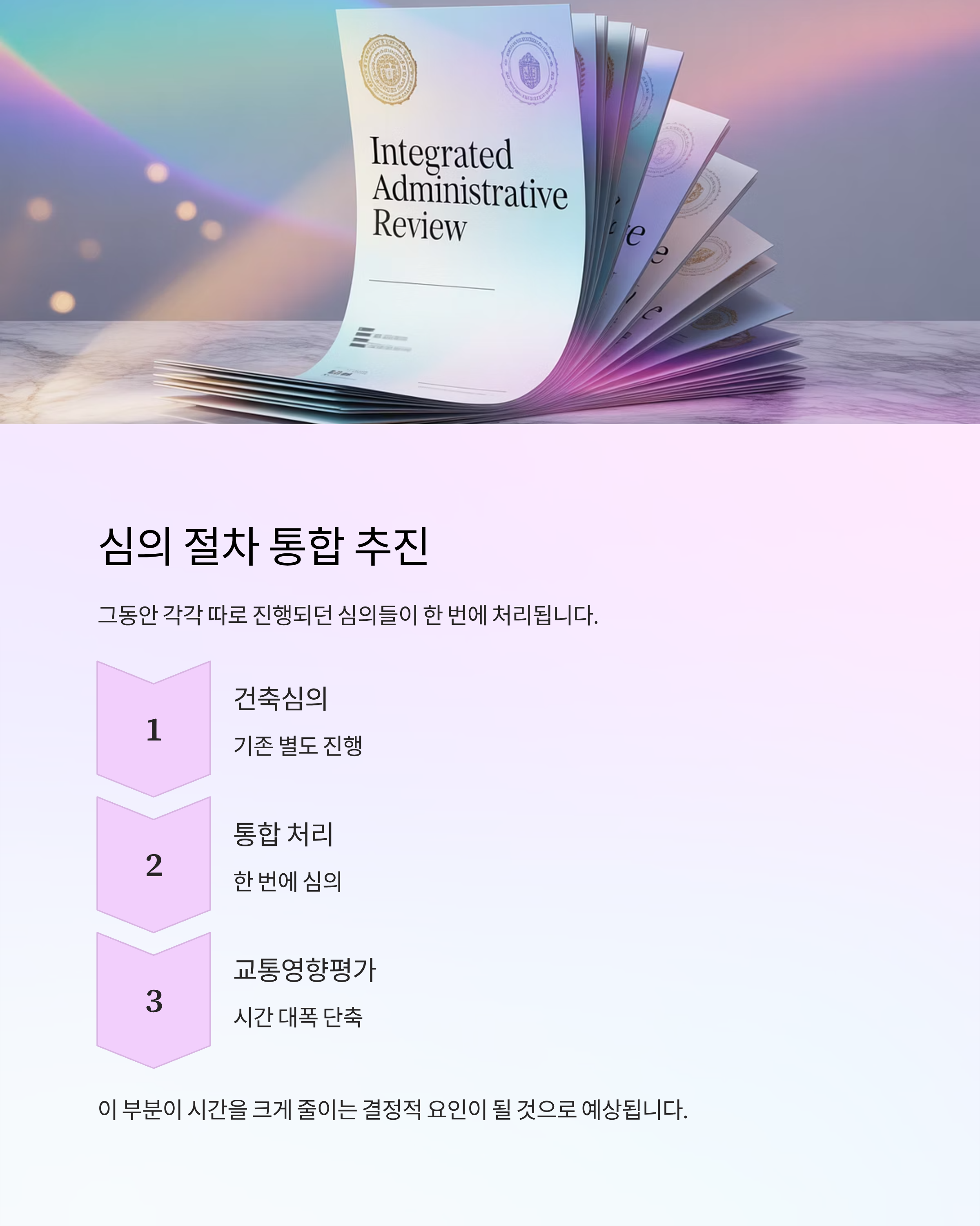 그동안 각각 따로 진행되던 심의 절차들이 통합되어 한 번에 처리됩니다. 이 부분이 시간을 크게 줄이는 결정적 요인이 될 것으로 보입니다.