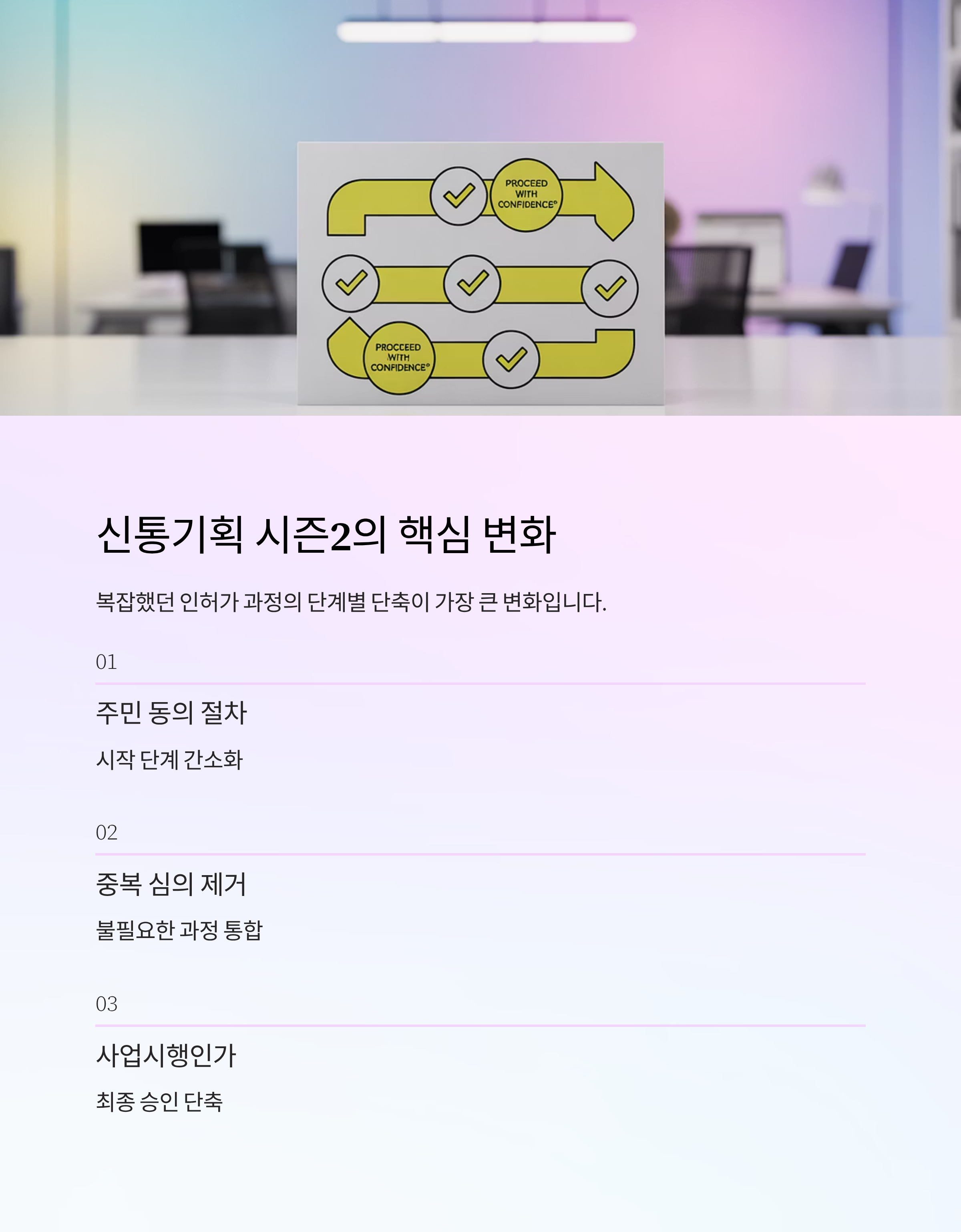 이번 시즌2에서 가장 큰 변화는 복잡했던 인허가 과정의 단계별 단축입니다. 주민 동의 절차부터 사업시행인가까지 이어지는 흐름에서 중복되는 심의 과정을 줄여 시간을 대폭 절약할 수 있도록 했습니다.