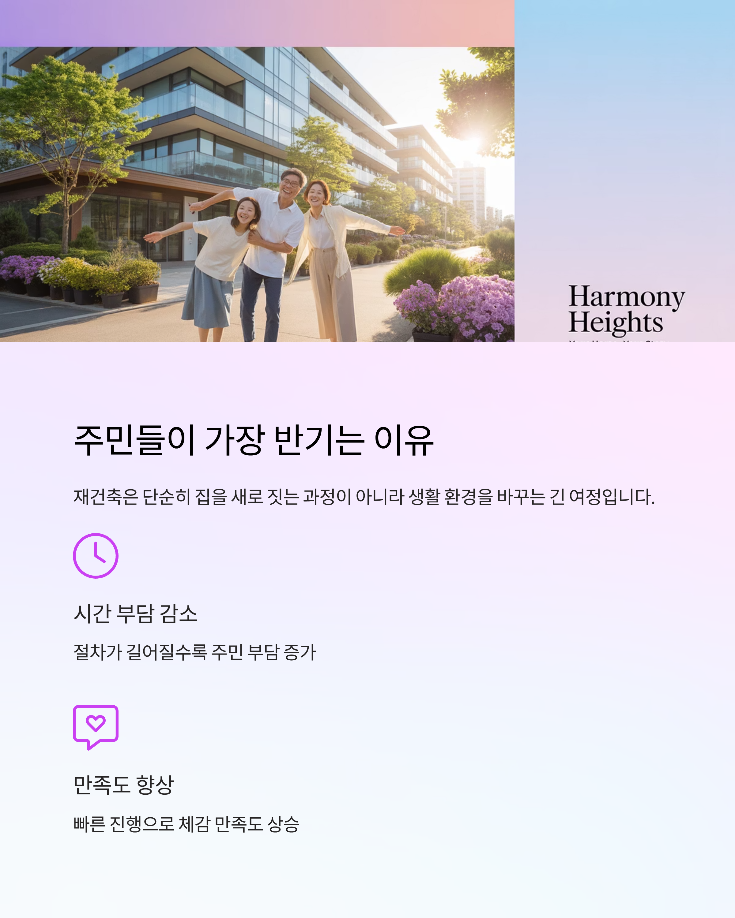 재건축 사업은 단순히 집을 새로 짓는 과정이 아니라, 생활 환경을 바꾸는 긴 여정입니다. 절차가 길어질수록 주민들의 부담과 불편은 커질 수밖에 없는데요. 이번 정책으로 사업이 보다 빠르게 진행된다면 체감 만족도도 올라갈 수 있습니다.