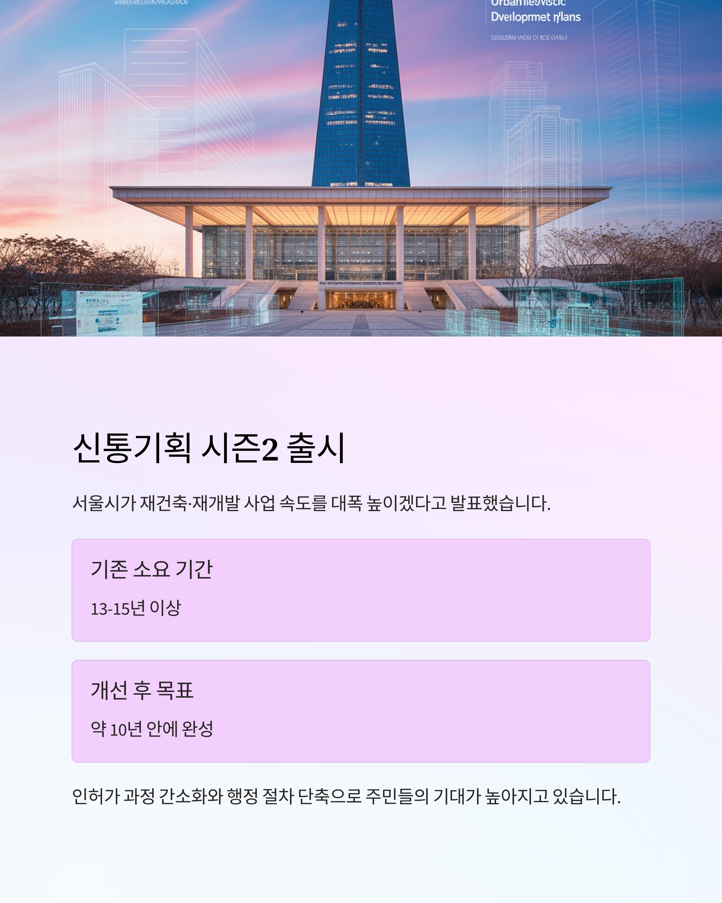 서울시가 ‘신통기획 시즌2’를 내놓으며 재건축·재개발 사업의 속도를 대폭 높이겠다고 밝혔습니다. 기존에는 13년에서 15년 이상 걸리던 정비사업이 앞으로는 약 10년 안에 마무리될 수 있도록 인허가 과정을 간소화하고 행정 절차를 줄인다는 계획입니다. 재건축을 기다리는 주민들의 기대가 커지는 가운데, 실제로 어떤 변화가 있을지 관심이 모이고 있습니다.
