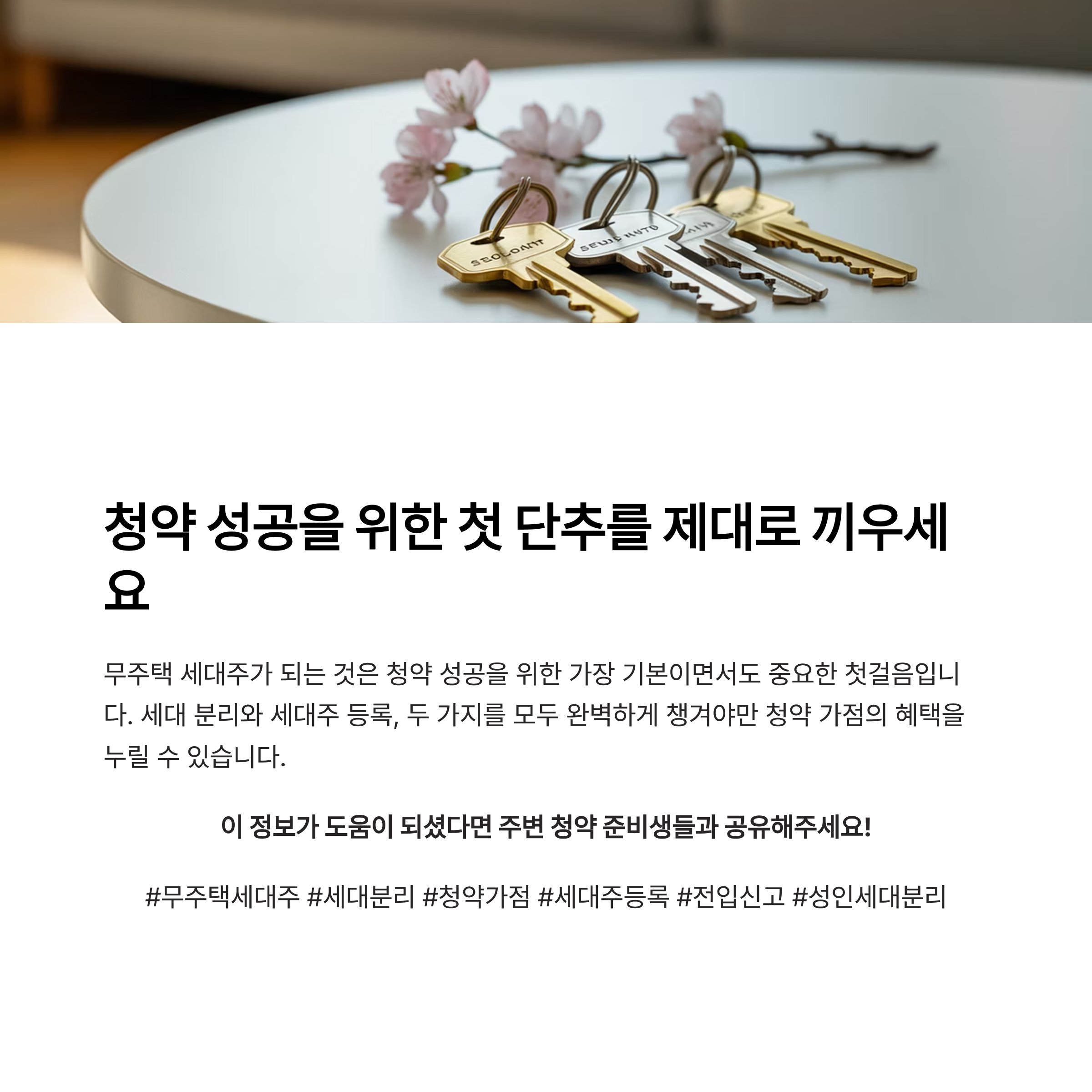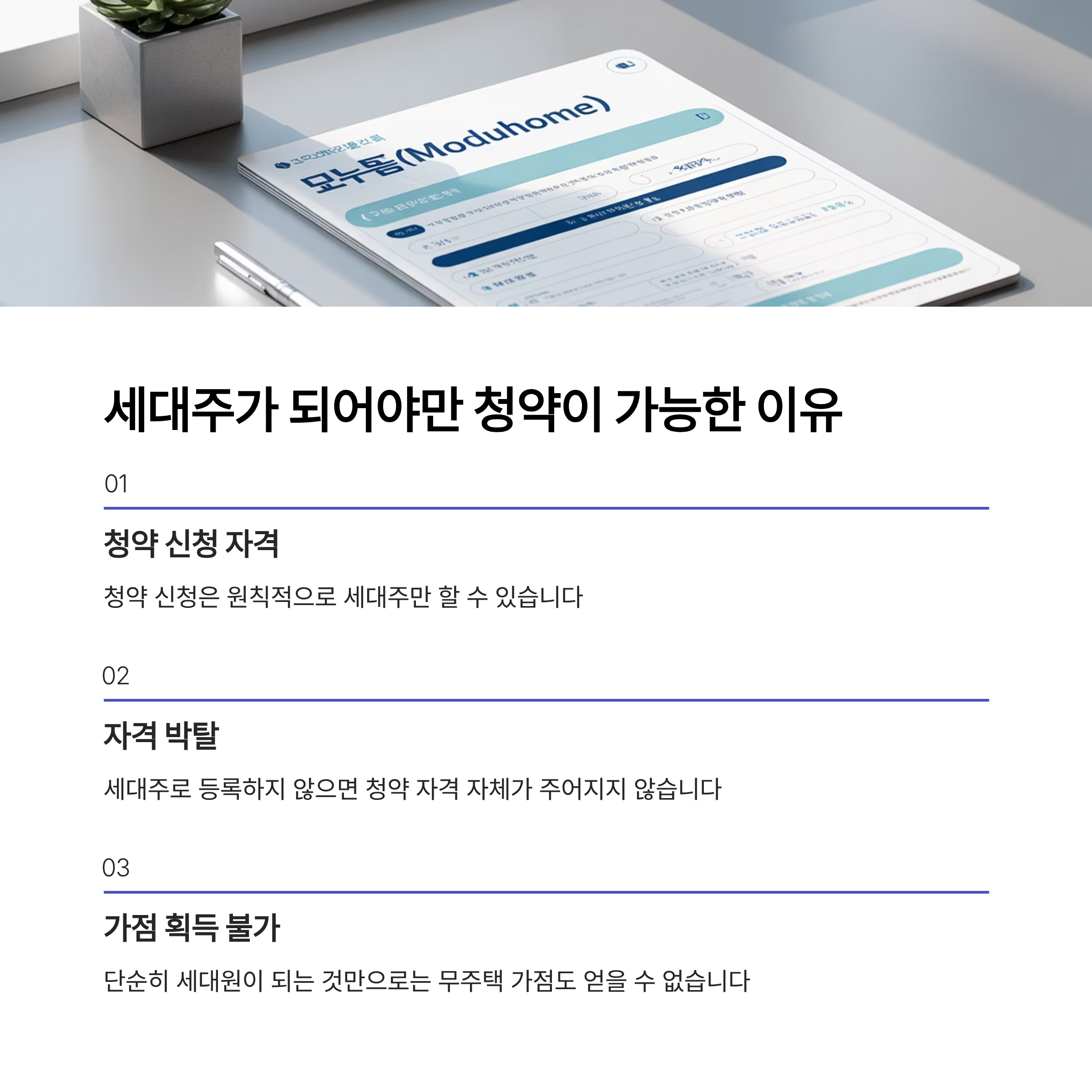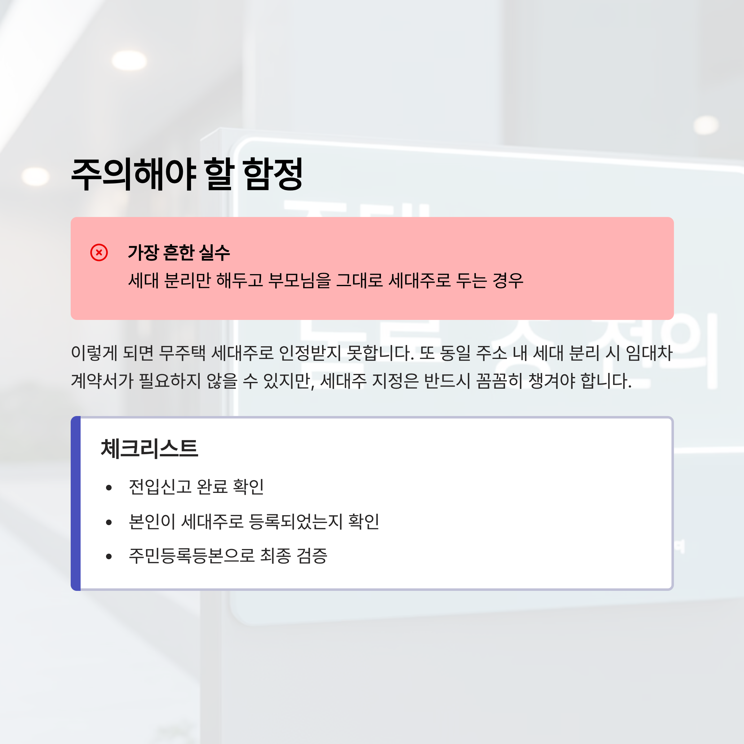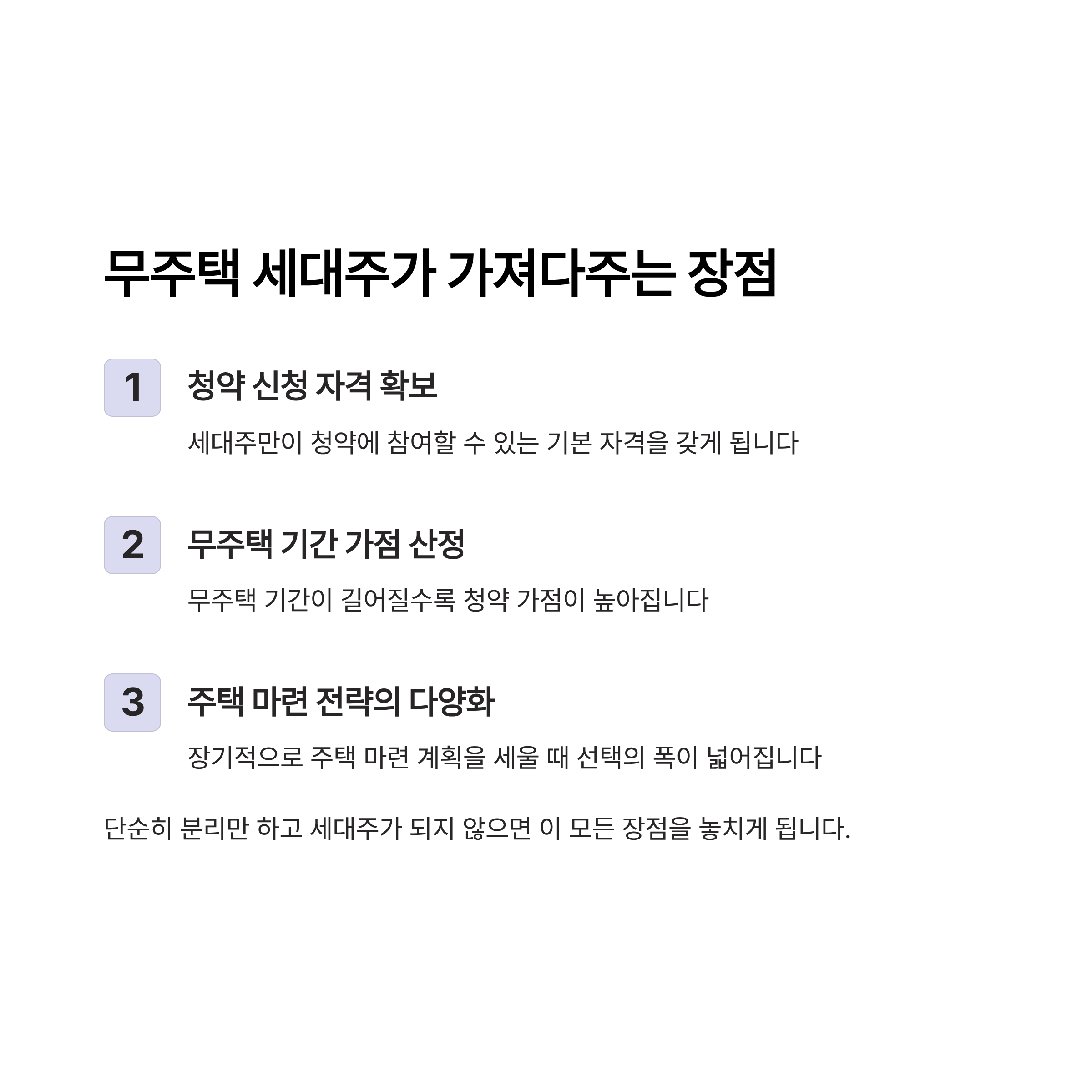첫째, 청약 신청 자격 확보. 둘째, 무주택 기간 가점 산정. 셋째, 장기적으로 주택 마련 전략을 세울 때 선택의 폭이 넓어집니다. 단순히 분리만 하고 세대주가 되지 않으면 이 모든 장점을 놓치게 됩니다.