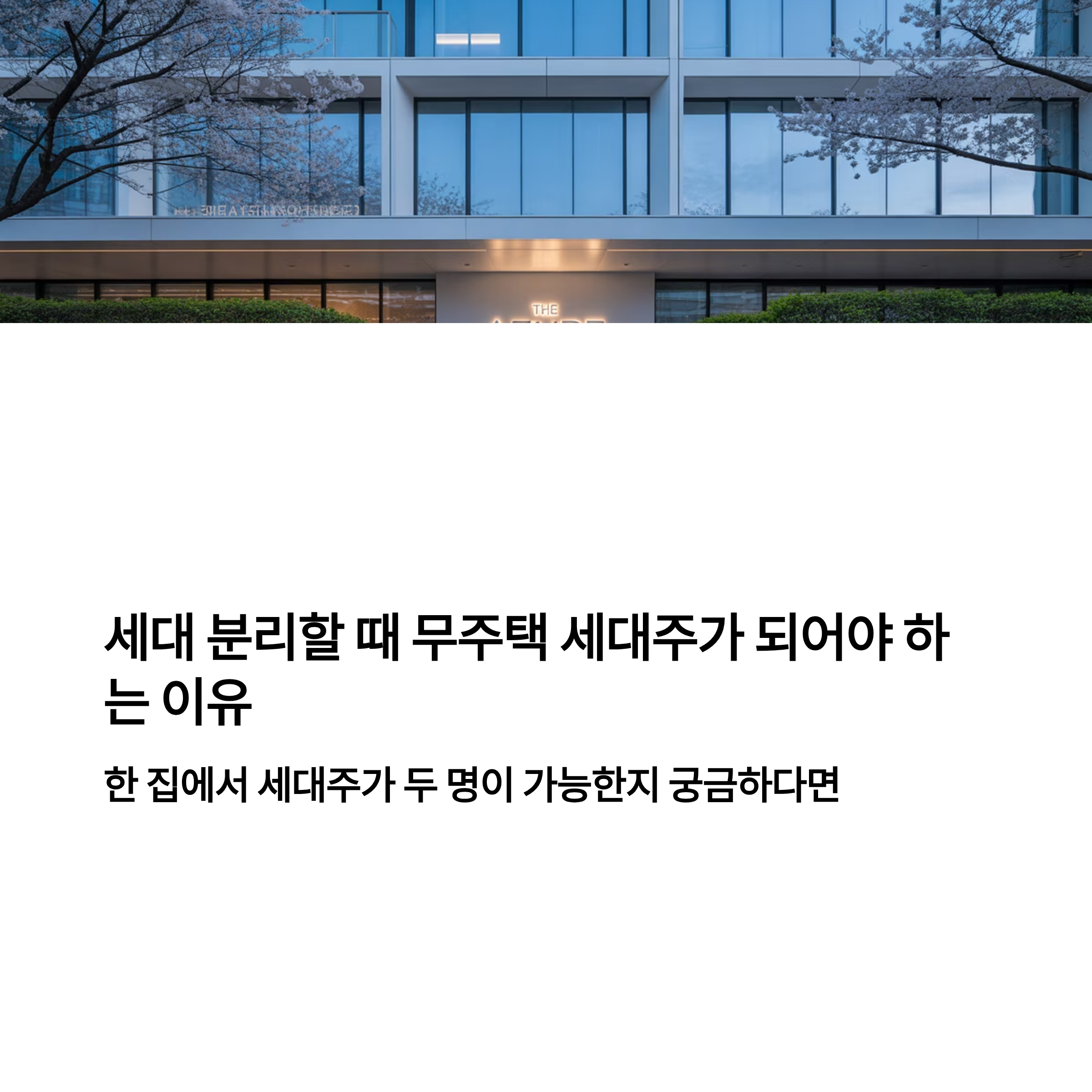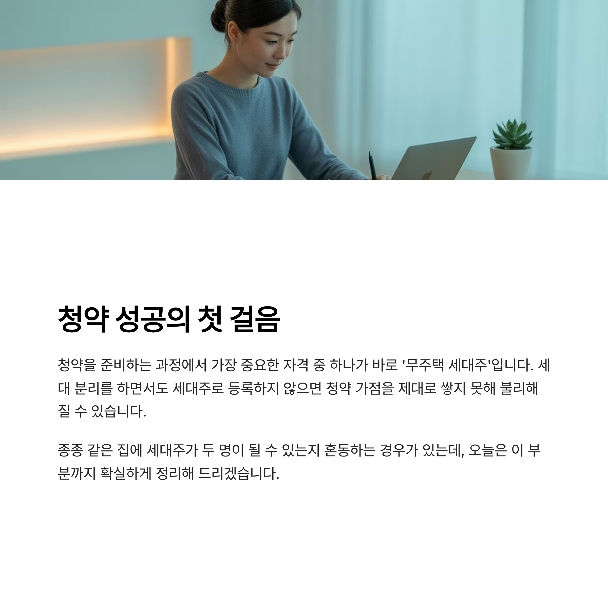 청약을 준비하는 과정에서 가장 중요한 자격 중 하나가 바로 ‘무주택 세대주’입니다. 세대 분리를 하면서도 세대주로 등록하지 않으면 청약 가점을 제대로 쌓지 못해 불리해질 수 있습니다. 또 종종 같은 집에 세대주가 두 명이 될 수 있는지 혼동하는 경우가 있는데, 오늘은 이 부분까지 확실하게 정리해 드리겠습니다.