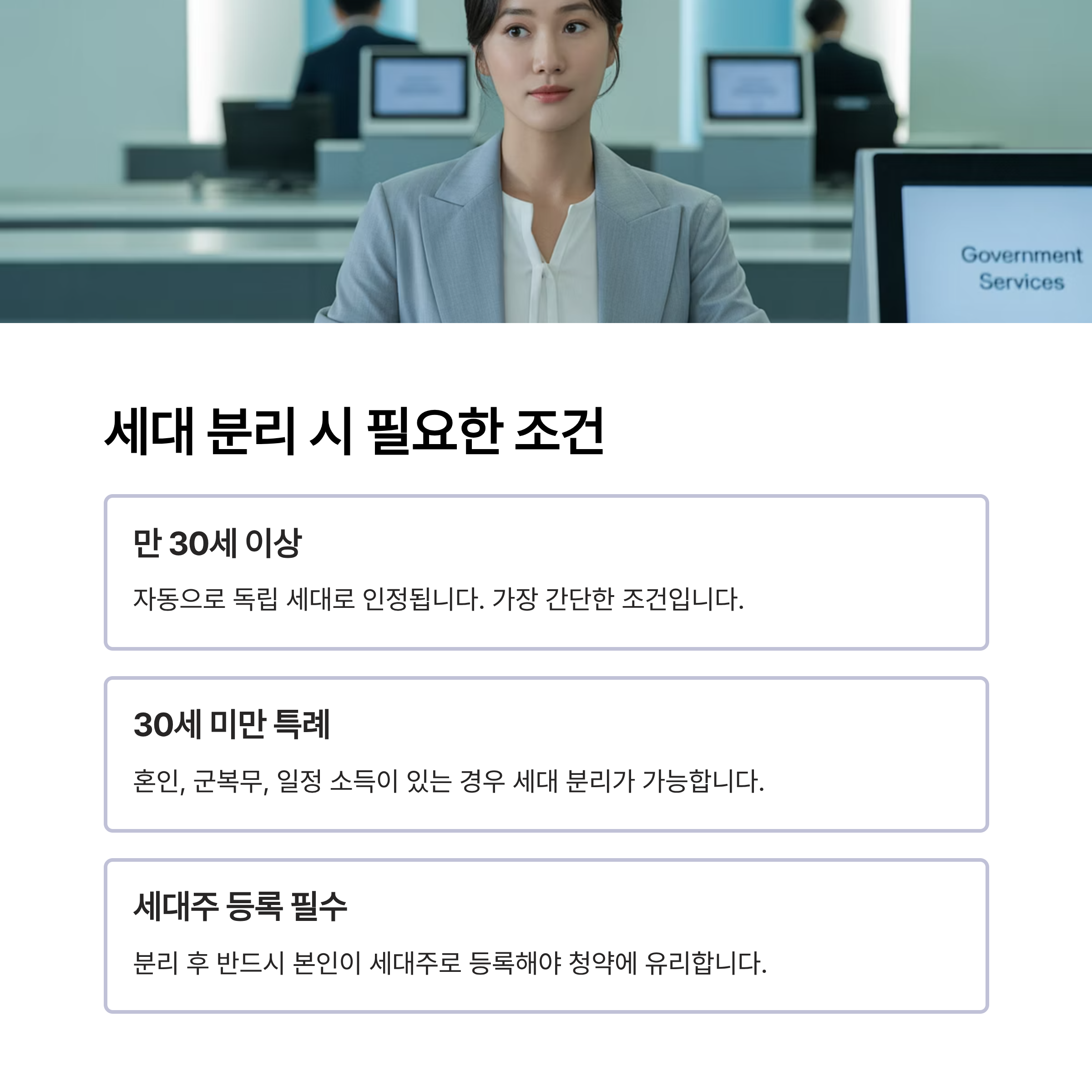 만 30세 이상이면 자동으로 독립 세대로 인정됩니다. 30세 미만이라도 혼인, 군복무, 일정 소득이 있는 경우 세대 분리가 가능합니다. 이때 반드시 본인이 세대주로 등록해야 청약에 유리합니다.