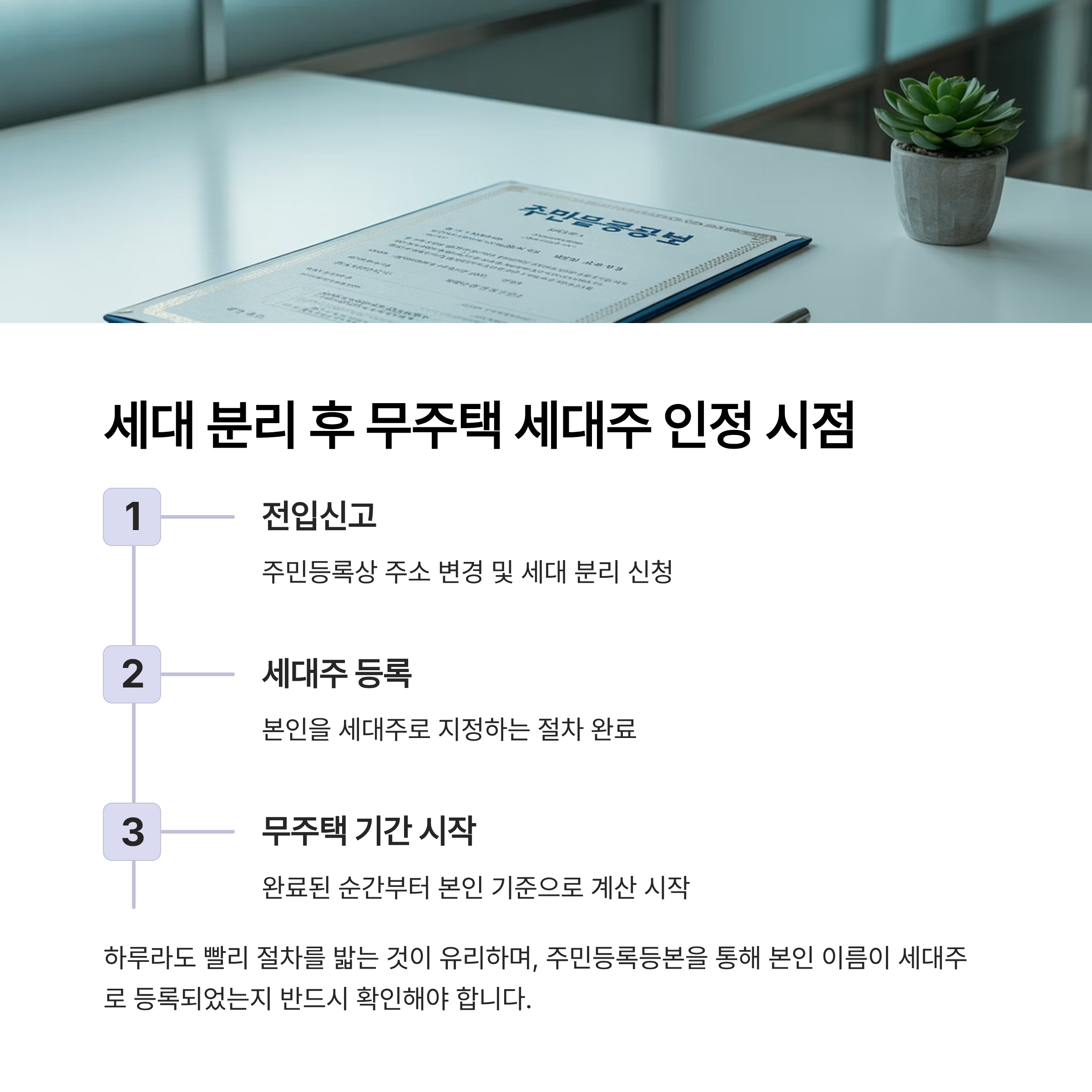 전입신고와 세대 분리가 완료된 순간부터 무주택 기간이 본인 기준으로 계산됩니다. 따라서 하루라도 빨리 절차를 밟는 것이 유리하며, 주민등록등본을 통해 본인 이름이 세대주로 등록되었는지 반드시 확인해야 합니다.
