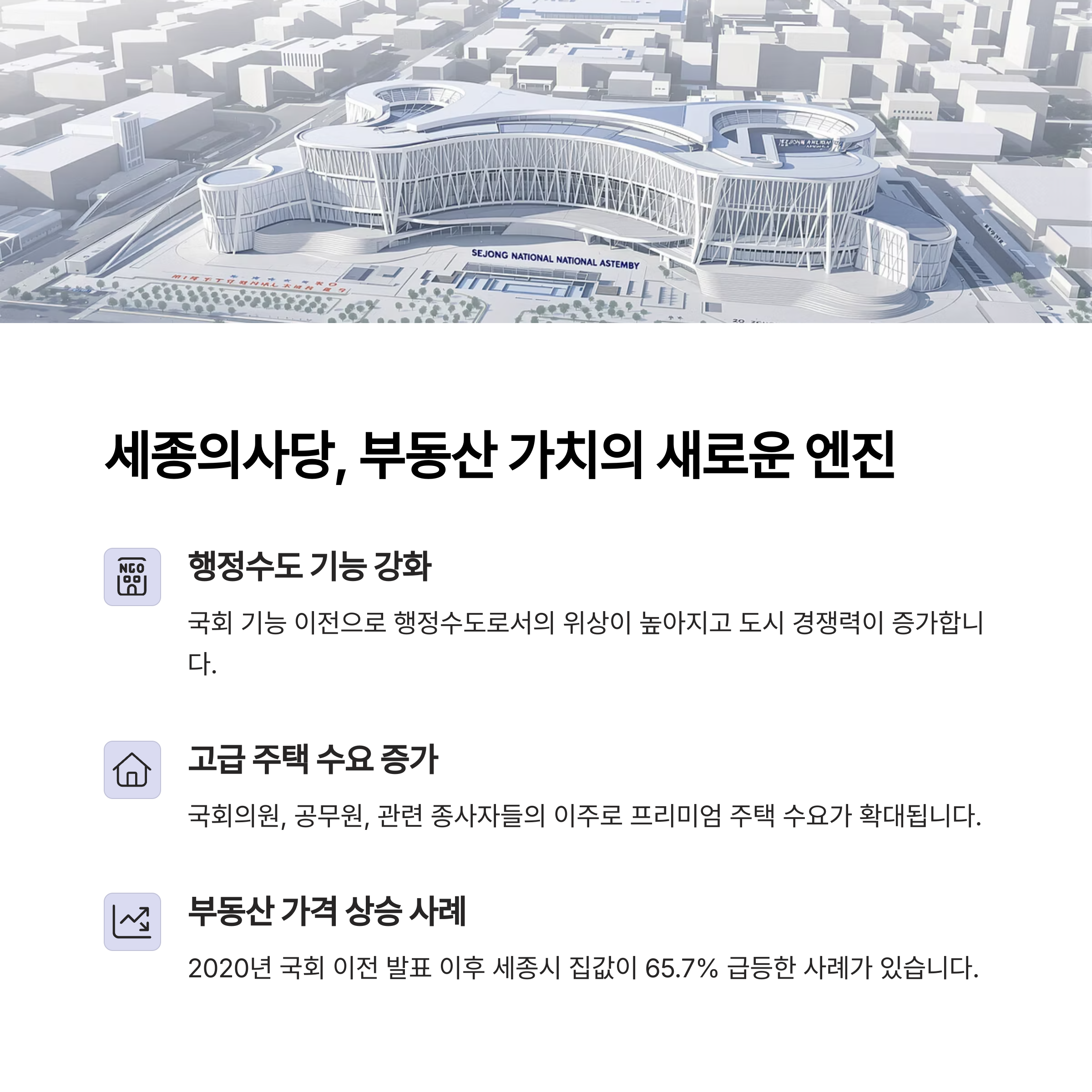 특히 국회 세종의사당은 단순한 행정 기능의 분산이 아니라 정치 기능까지 포함한 대규모 이전이라는 점에서 상징적이며, 이로 인해 세종시의 위상과 입지가 한 단계 도약할 가능성이 있습니다.