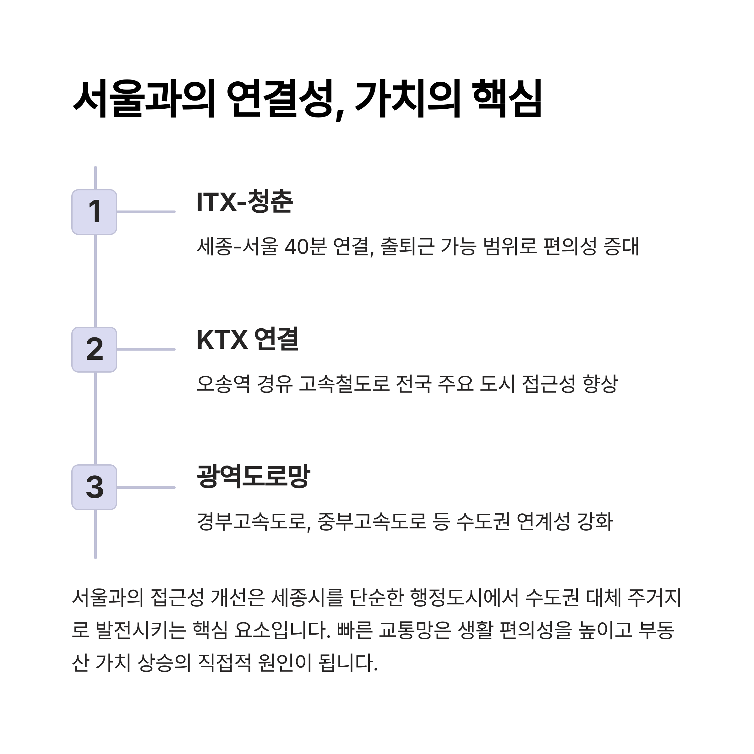 세종시의 가장 큰 약점 중 하나는 서울 접근성이었습니다. 하지만 KTX 조치원역 정차 확정, 광역 BRT 시스템, 그리고 향후 계획 중인 GTX 연결 검토 등은 이 약점을 점차 해소시키고 있습니다.