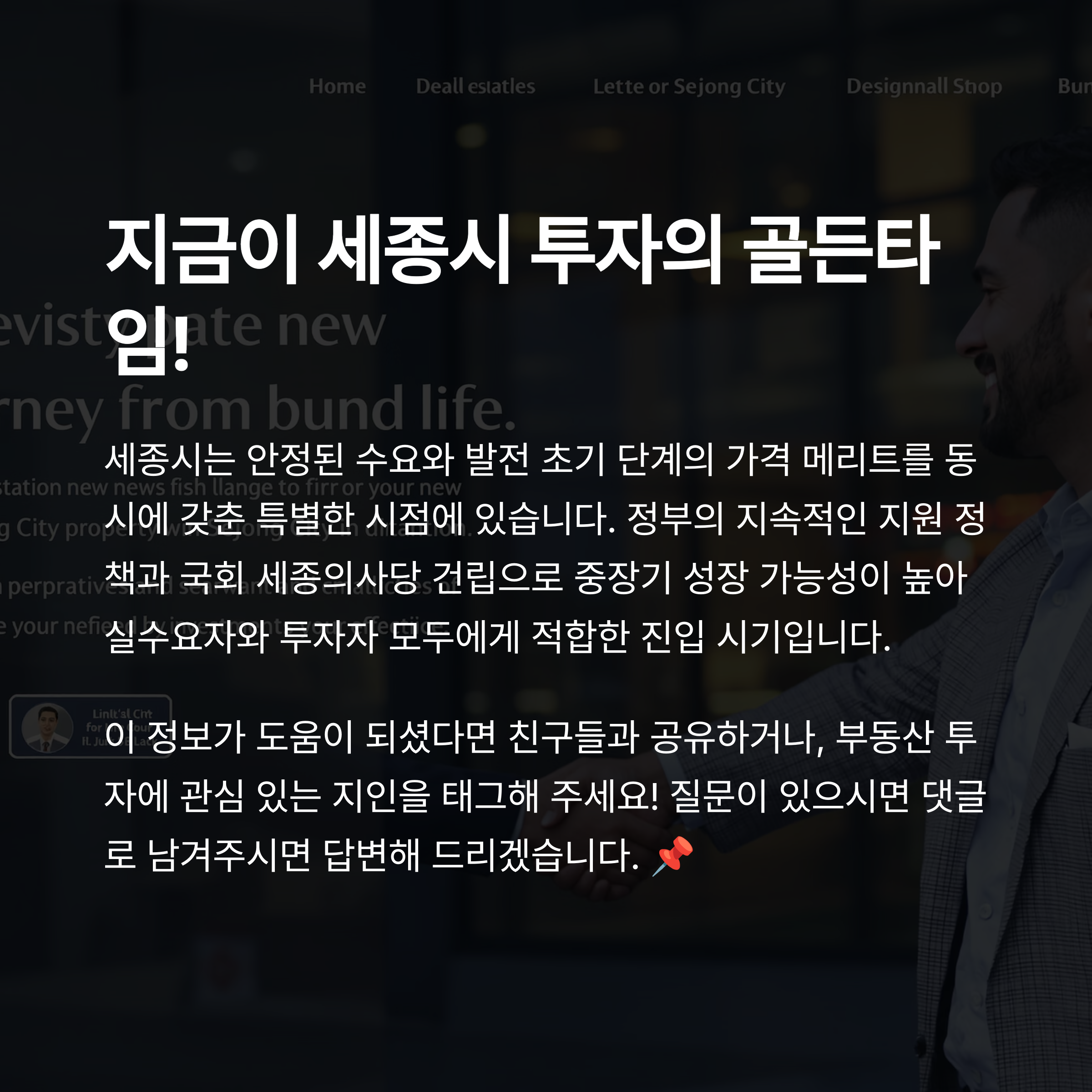 세종시 부동산 투자는 지금이 타이밍일 수 있으며, 올바른 전략과 충분한 분석이 동반된다면 매우 매력적인 기회가 될 수 있습니다.