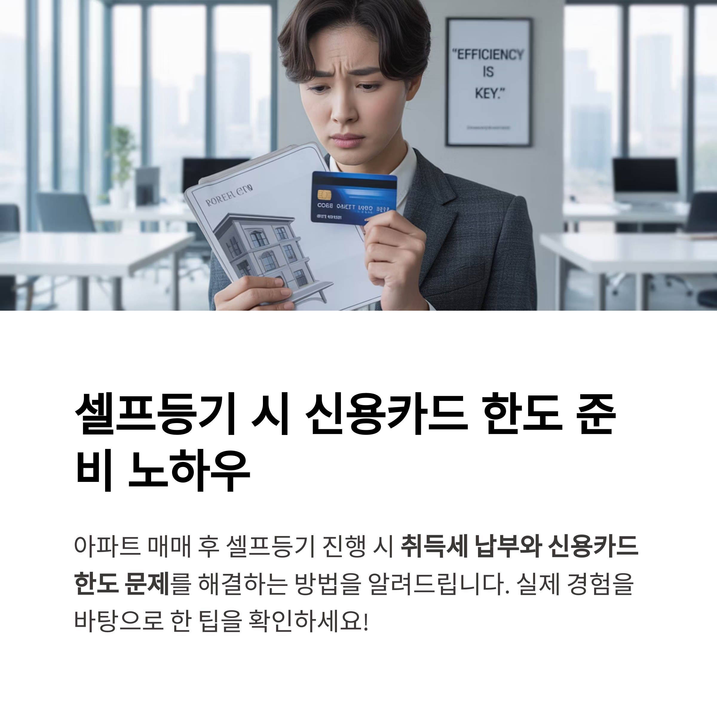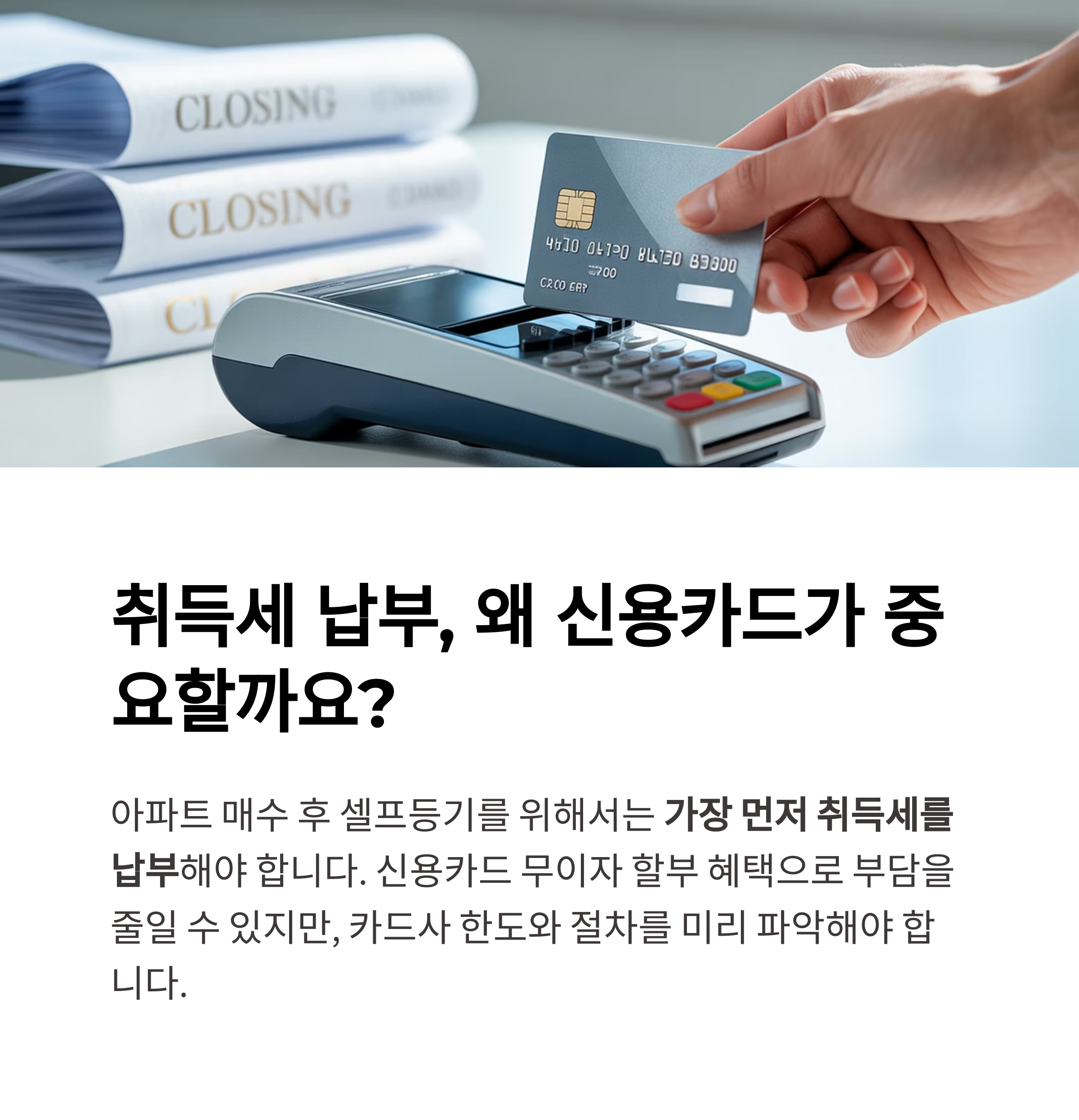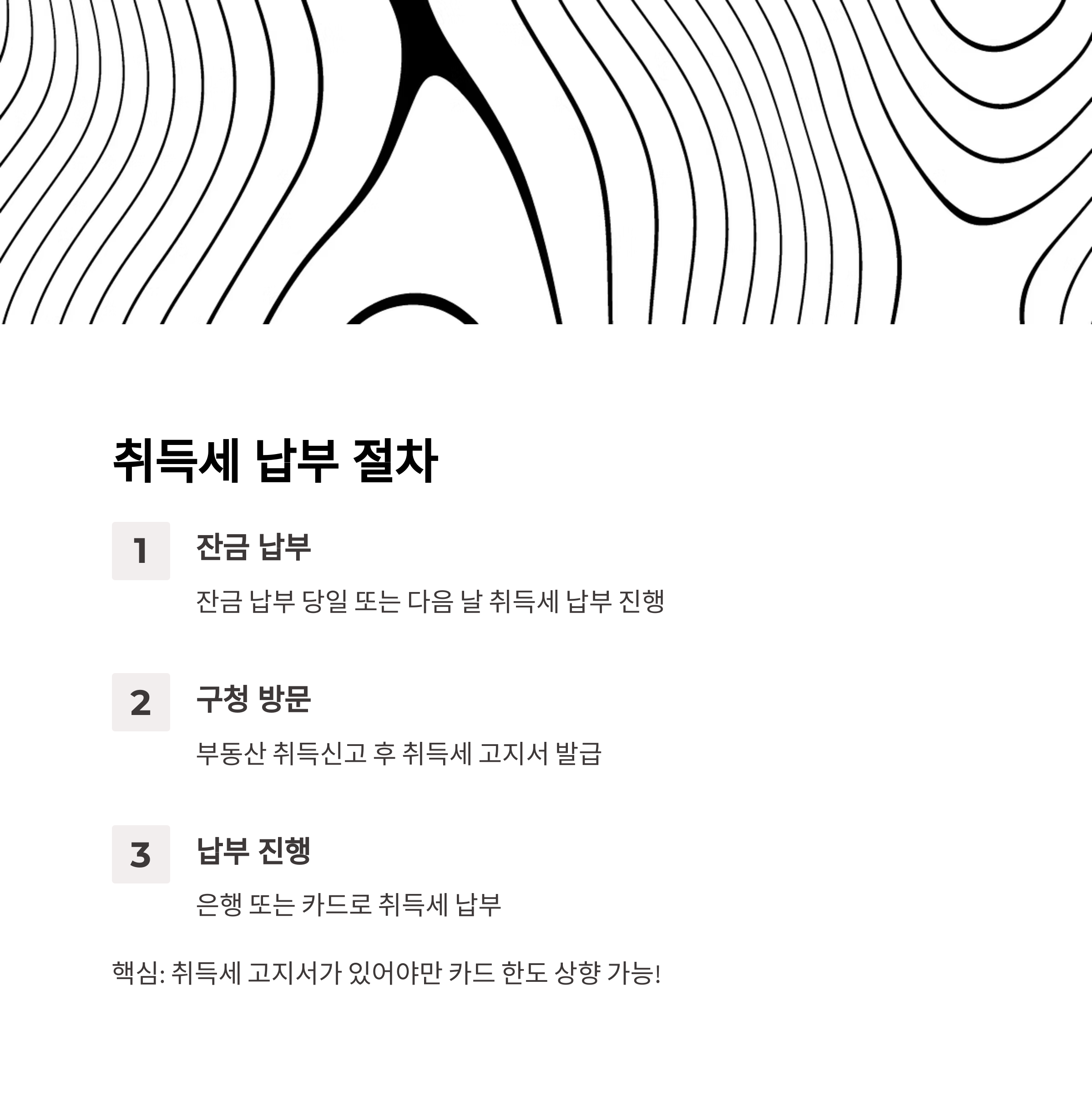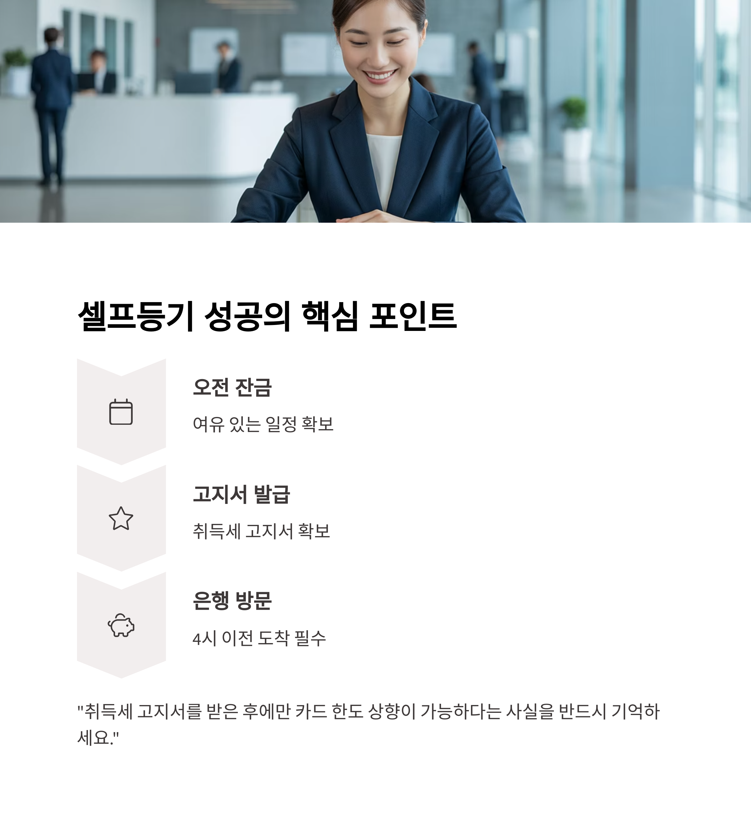 "취득세 고지서를 받은 후에만 카드 한도 상향이 가능하다는 사실을 반드시 기억하세요. 은행 마감 시간 전 도착하려면 잔금은 반드시 오전 시간으로 조율하셔야 합니다."