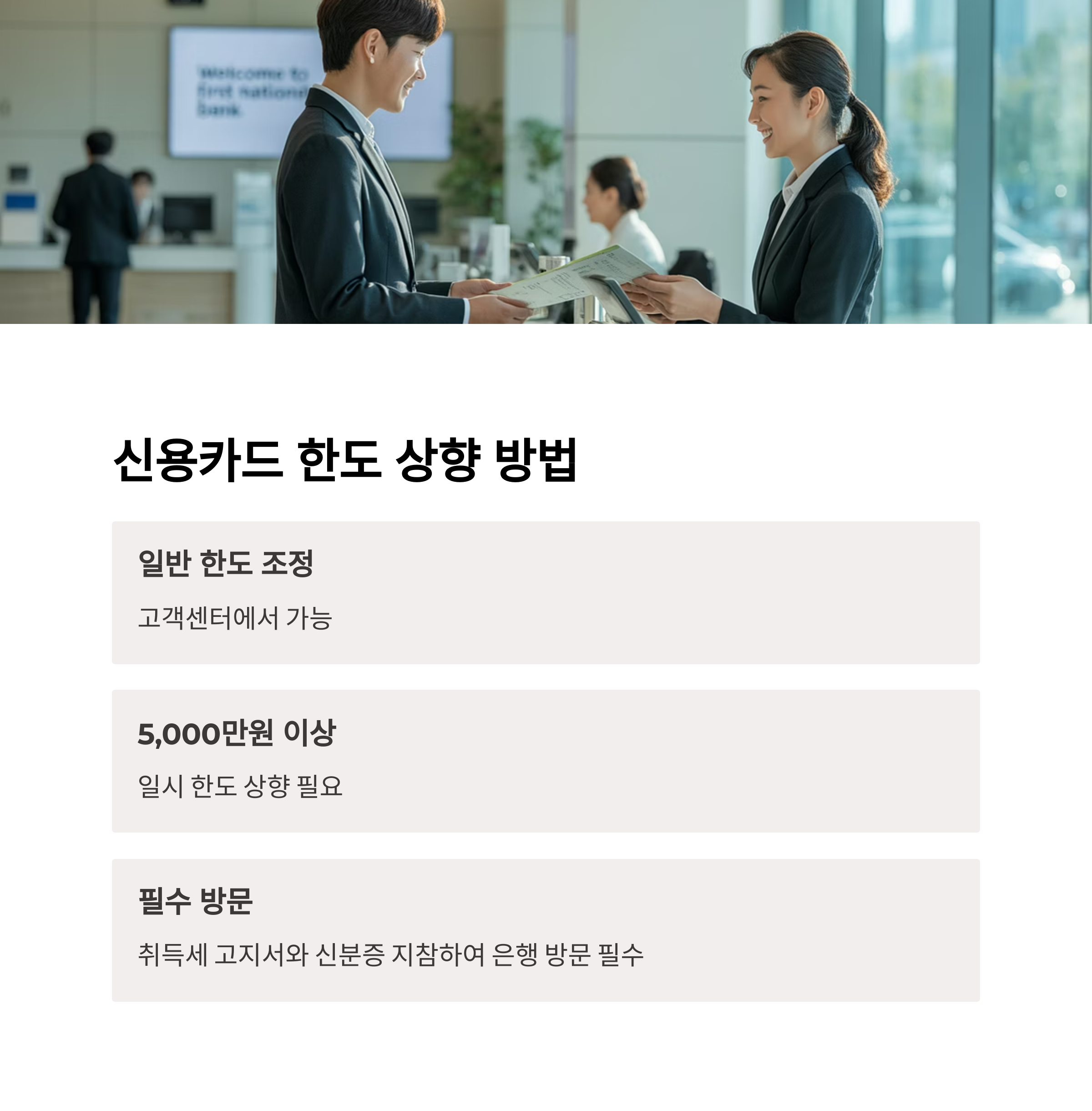 "지방세 납부 목적으로 한도를 올리려면 반드시 취득세 고지서와 신분증을 지참한 후 은행 영업점에 방문해야 한다"는 점을 미리 알고 있어야 합니다.