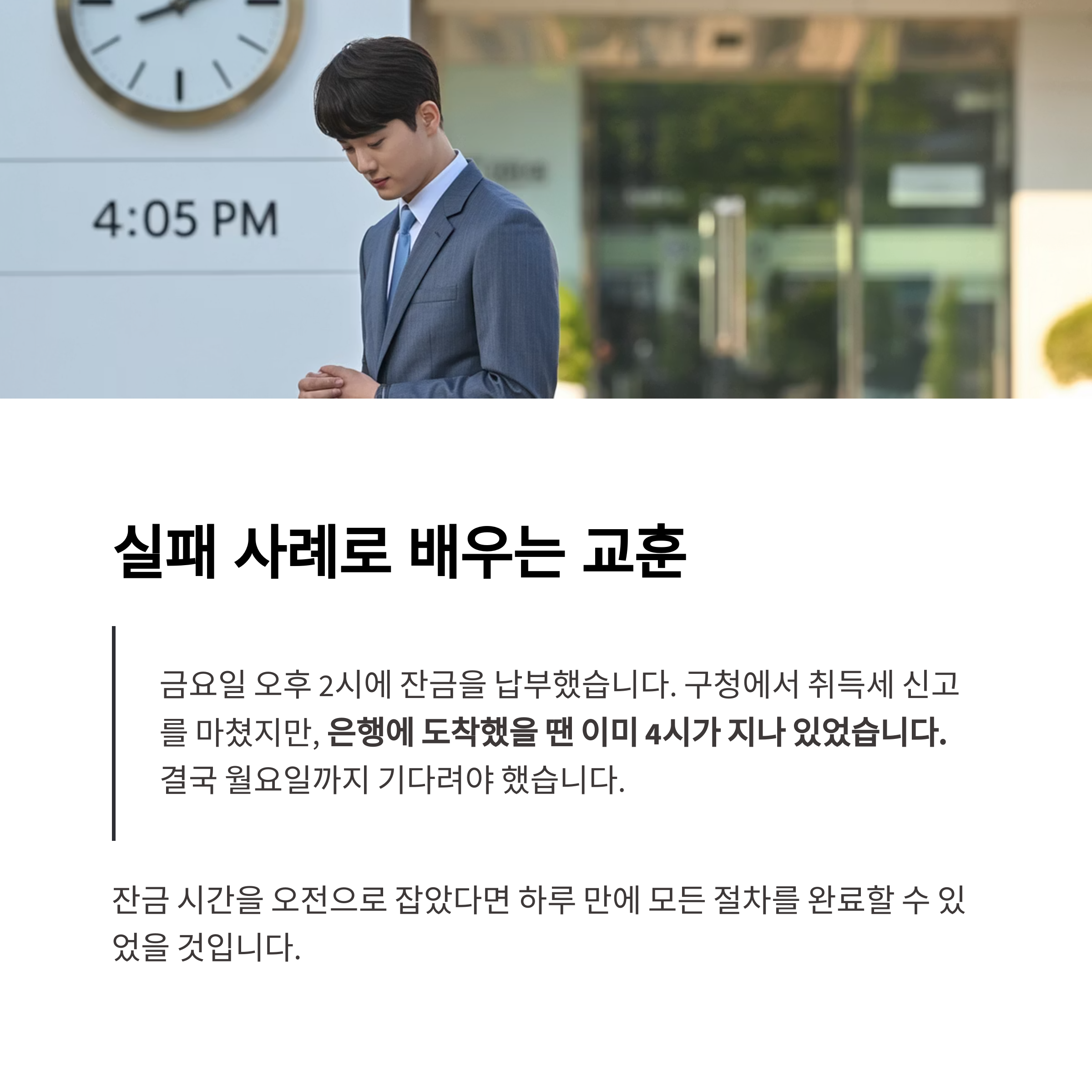 "금요일 오후 3시에 잔금을 납부했습니다. 이후 곧장 구청에 가서 취득세 신고 및 고지서 발급을 마쳤지만, 은행에 도착했을 땐 이미 4시가 지나 있었습니다. 결국 그날 등기소 방문도 못했고, 월요일까지 기다려야 했습니다."