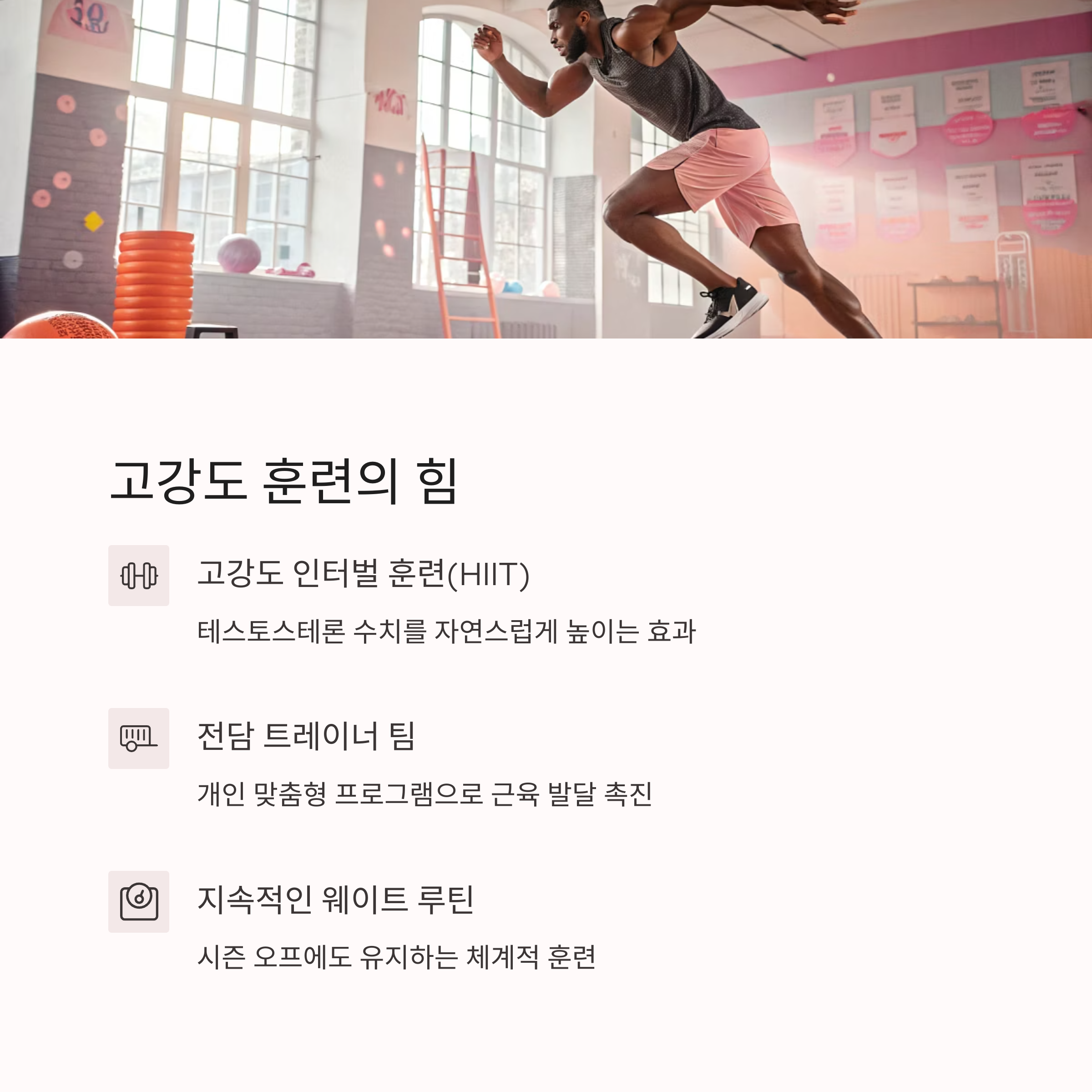 | 운동 | 고강도 인터벌 + 웨이트 | 근육량 증가 |