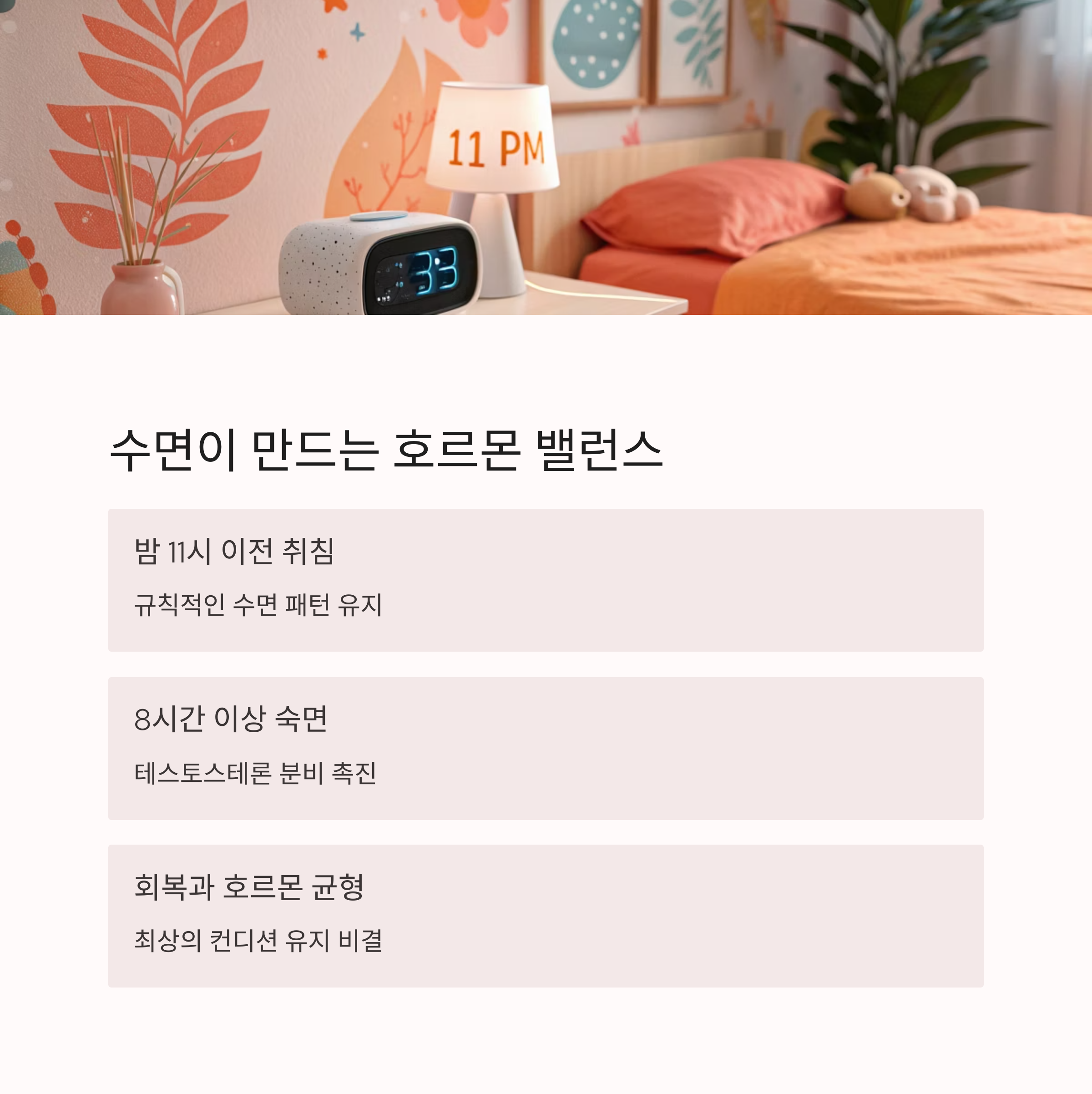 | 수면 | 8시간, 밤 11시 이전 취침 | 호르몬 최적화 |
