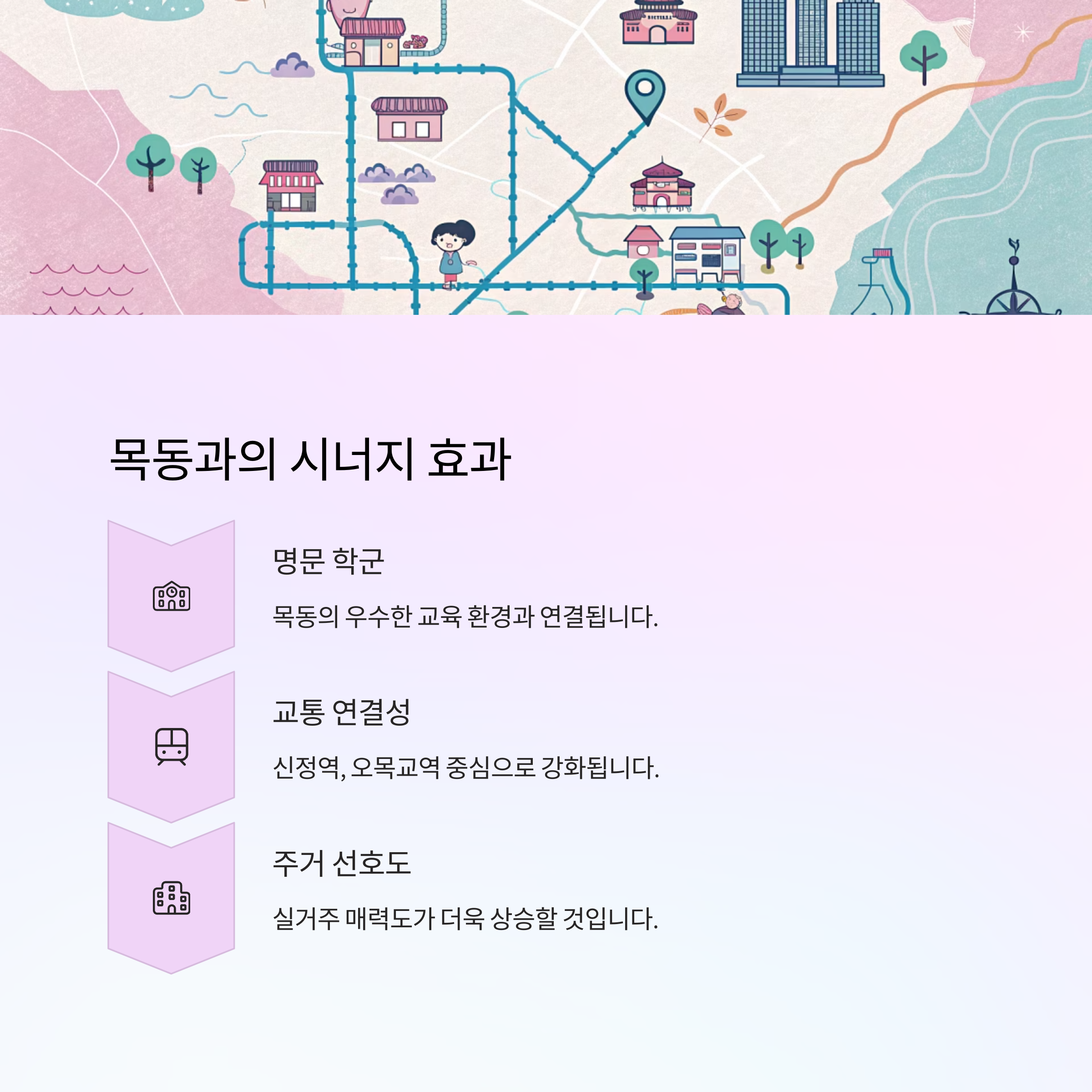 목동이 가진 명문 학군, 편리한 교통, 안정된 인프라와 연결되면서 시너지를 형성합니다.
