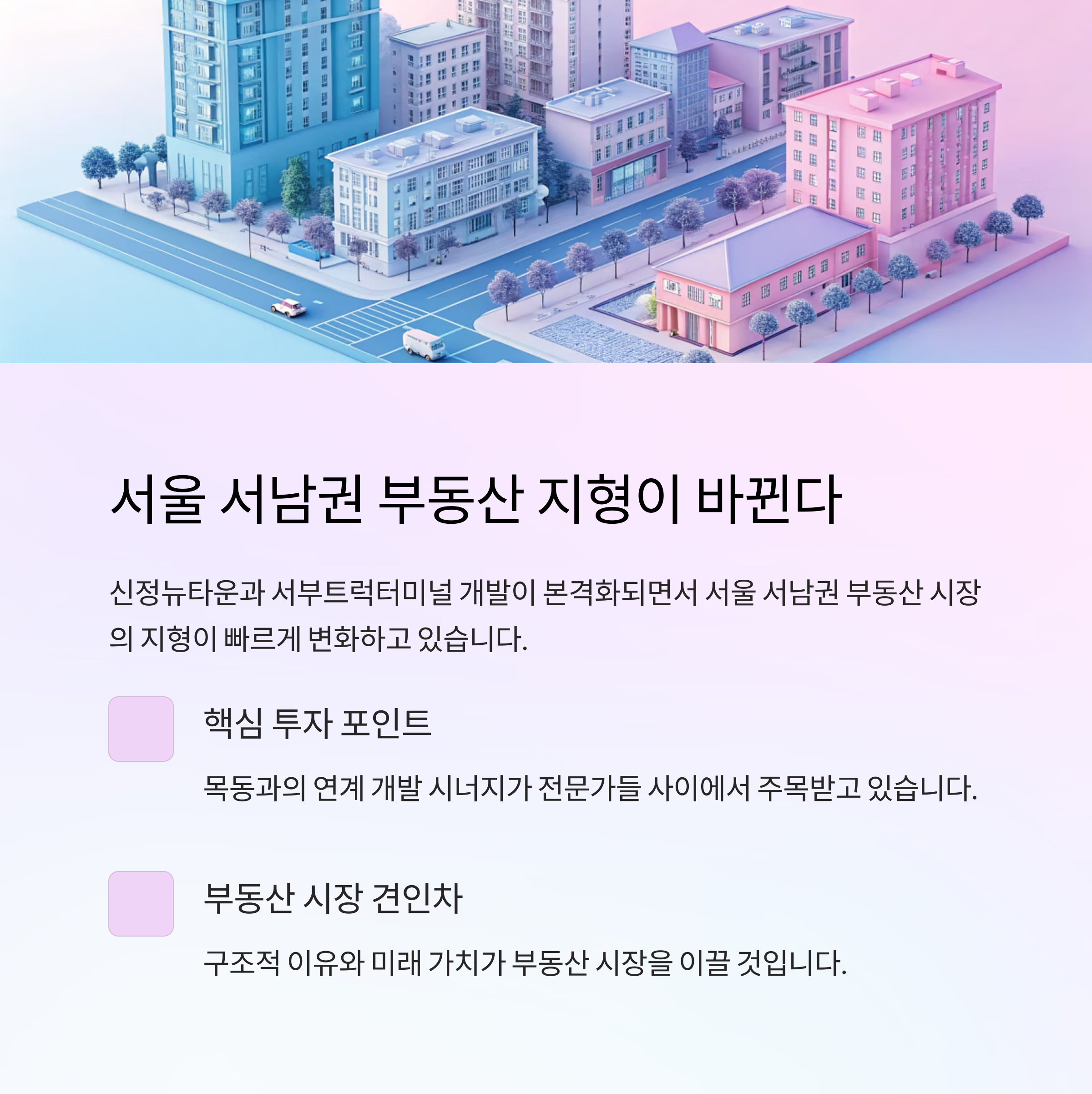 서울 중심 접근성과 학군, 생활권의 변화는 장기 거주 수요를 견인하는 요소가 될 것입니다.