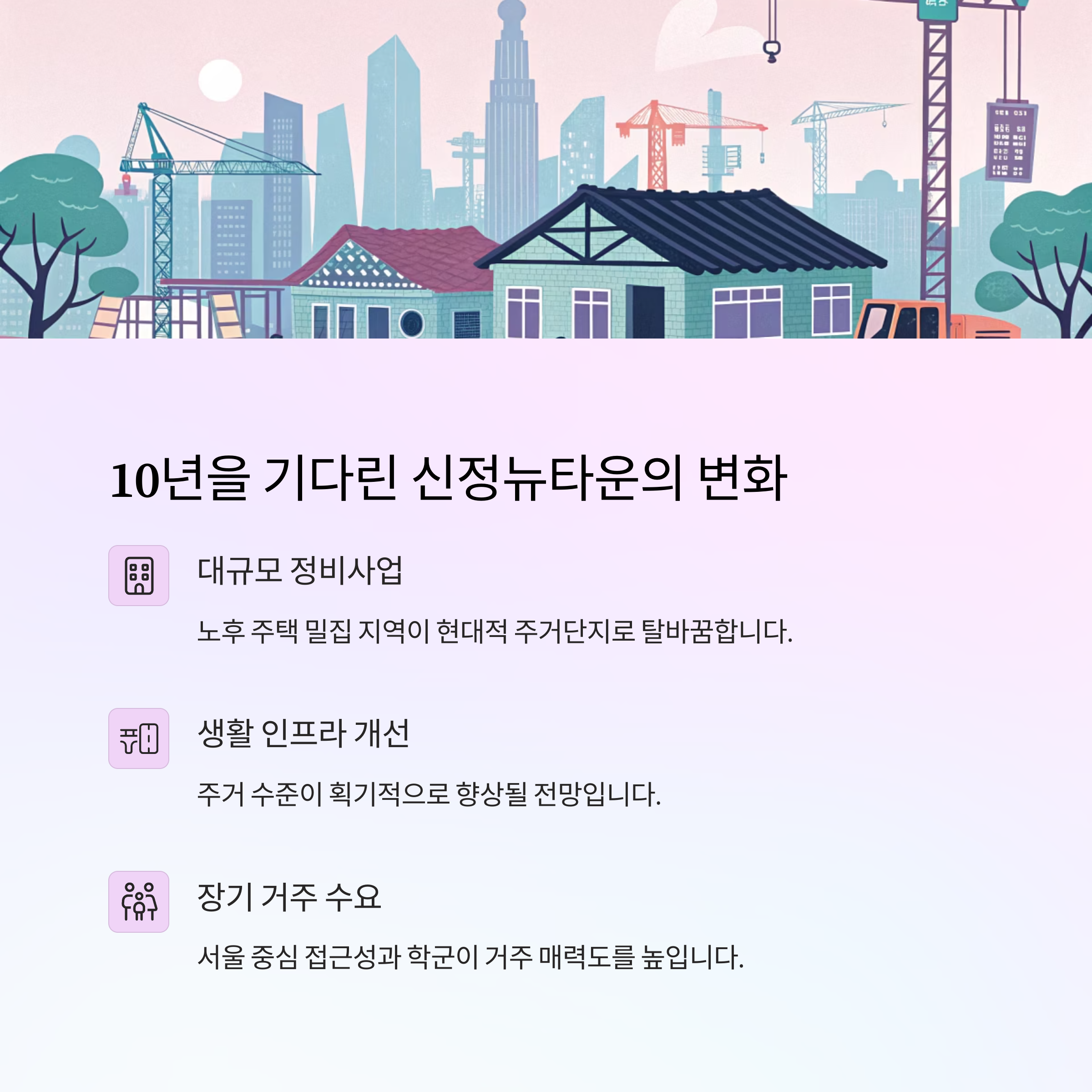 | 신정뉴타운 | 주거재개발 | 중~상 | 실거주·신혼부부 |