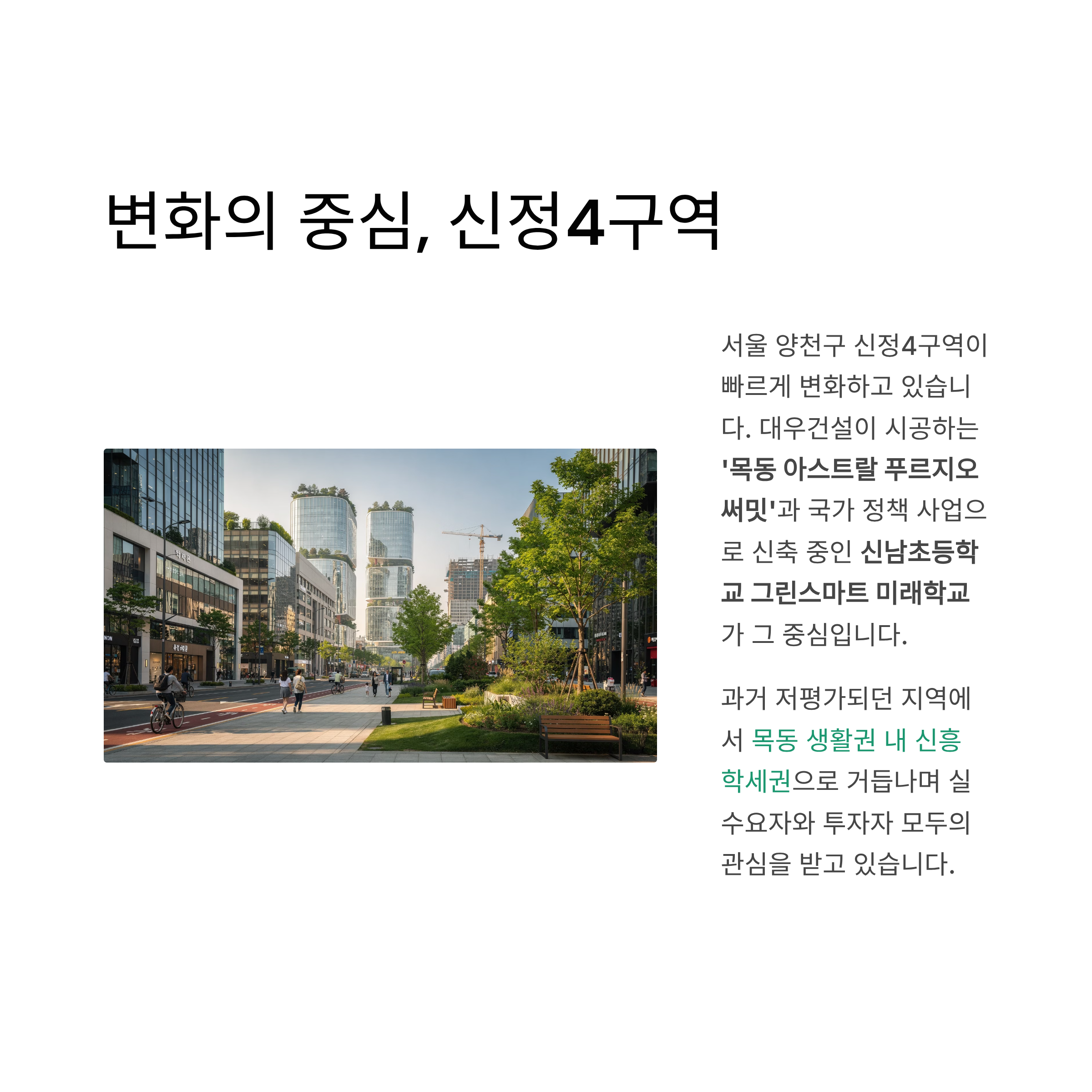 서울 양천구 신정4구역이 지금 빠르게 변화하고 있습니다. 이 변화의 중심에는 대우건설이 시공하는 ‘목동 아스트랄 푸르지오 써밋’과, 국가 정책 사업으로 신축 중인 신남초등학교 그린스마트 미래학교가 있습니다.