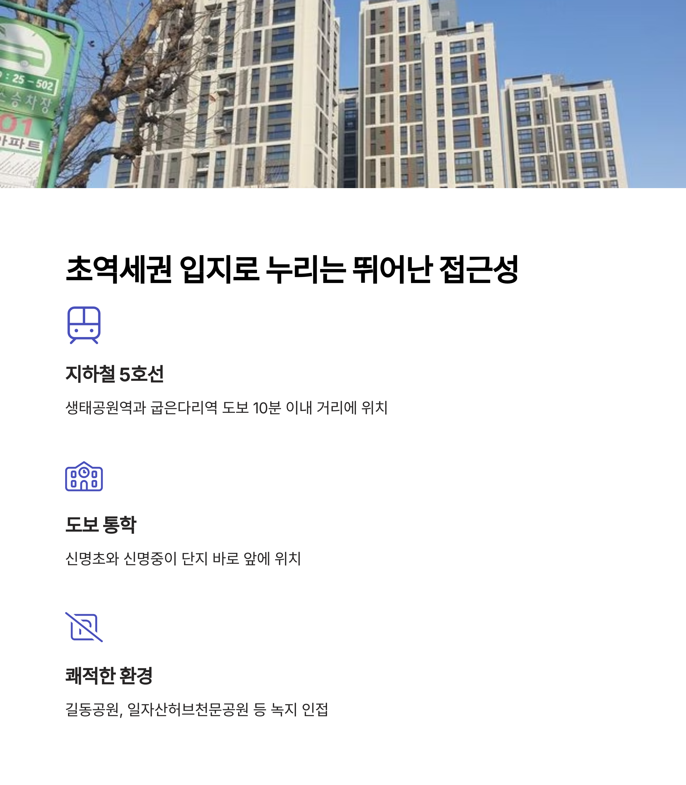 쾌적한 주거환경을 자랑합니다. 강동구 내에서도 자연과 접근성을 모두 갖춘 드문 입지입니다.