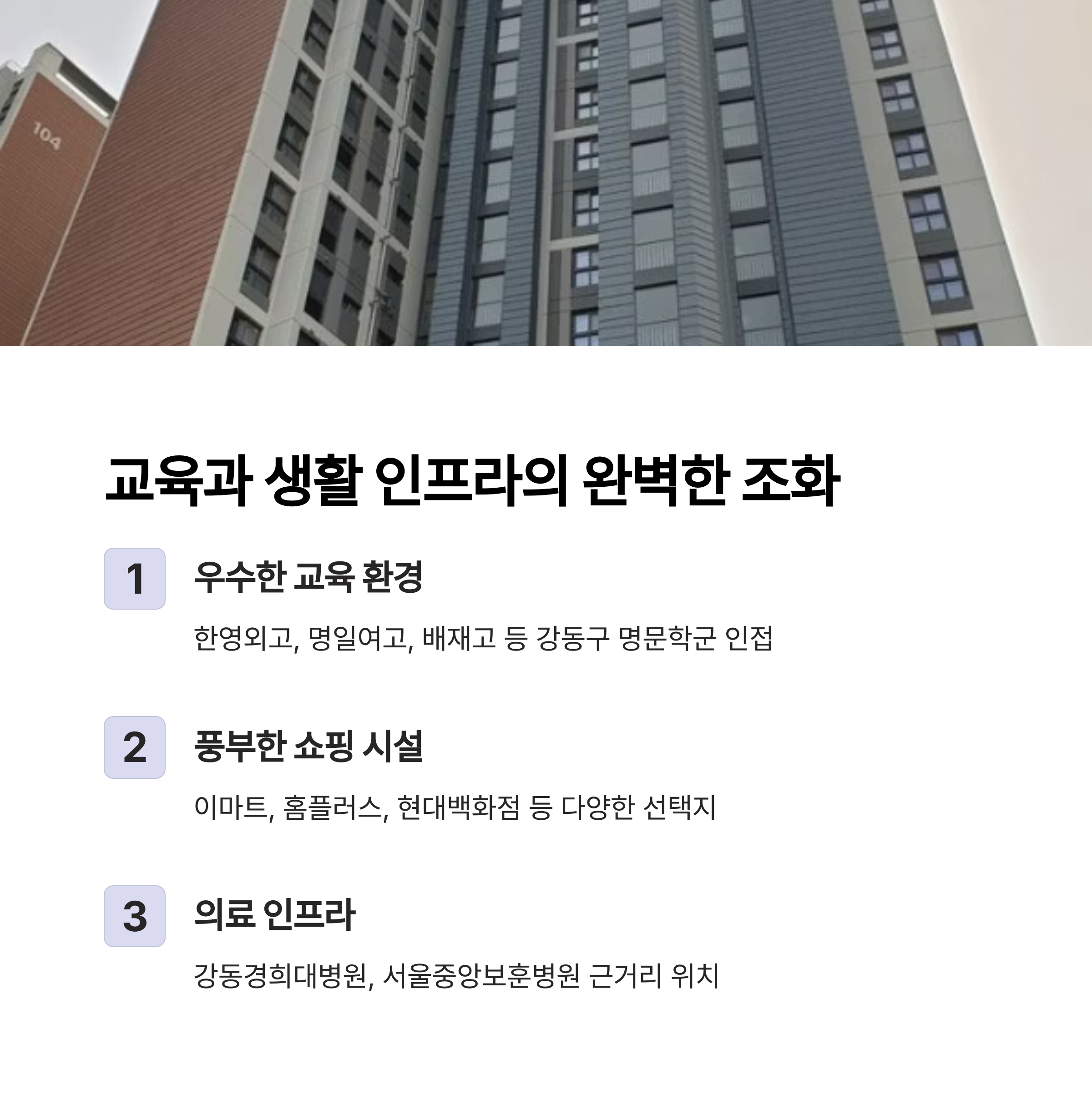 생활 인프라 역시 이마트, 홈플러스, 현대백화점 등 다양한 쇼핑시설과 강동경희대병원,