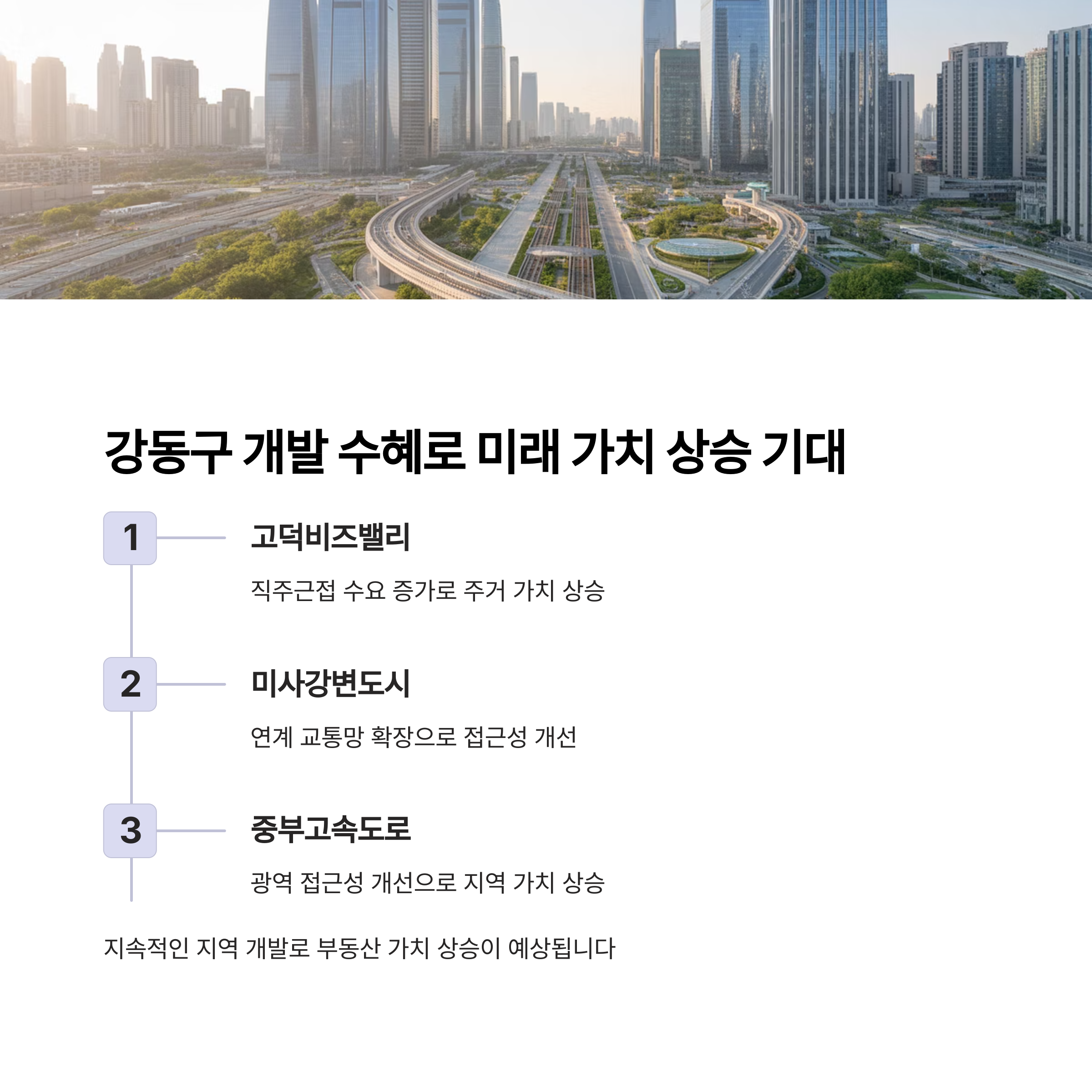 강동구는 미사신도시, 고덕비즈밸리, 중부고속도로 등 주요 개발과 연계돼