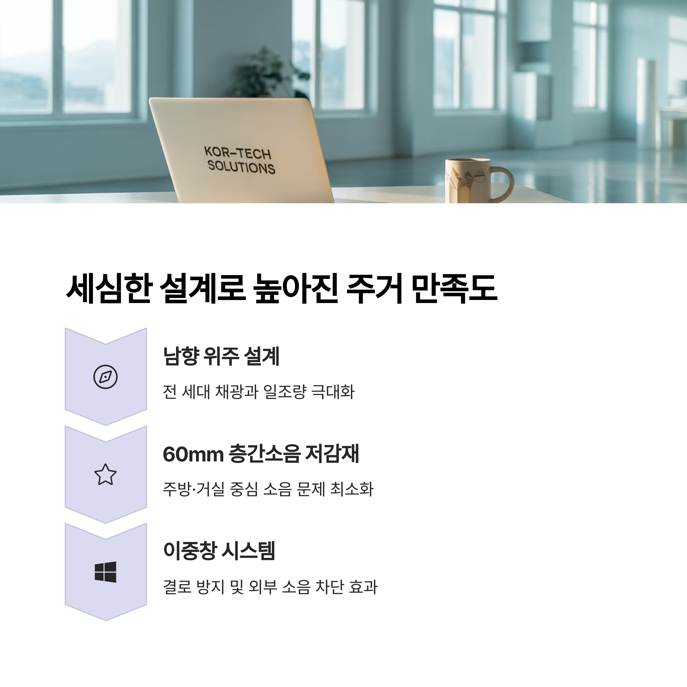 전 세대 남향 위주 설계와 60mm 층간소음 저감재, 이중창 시스템 등