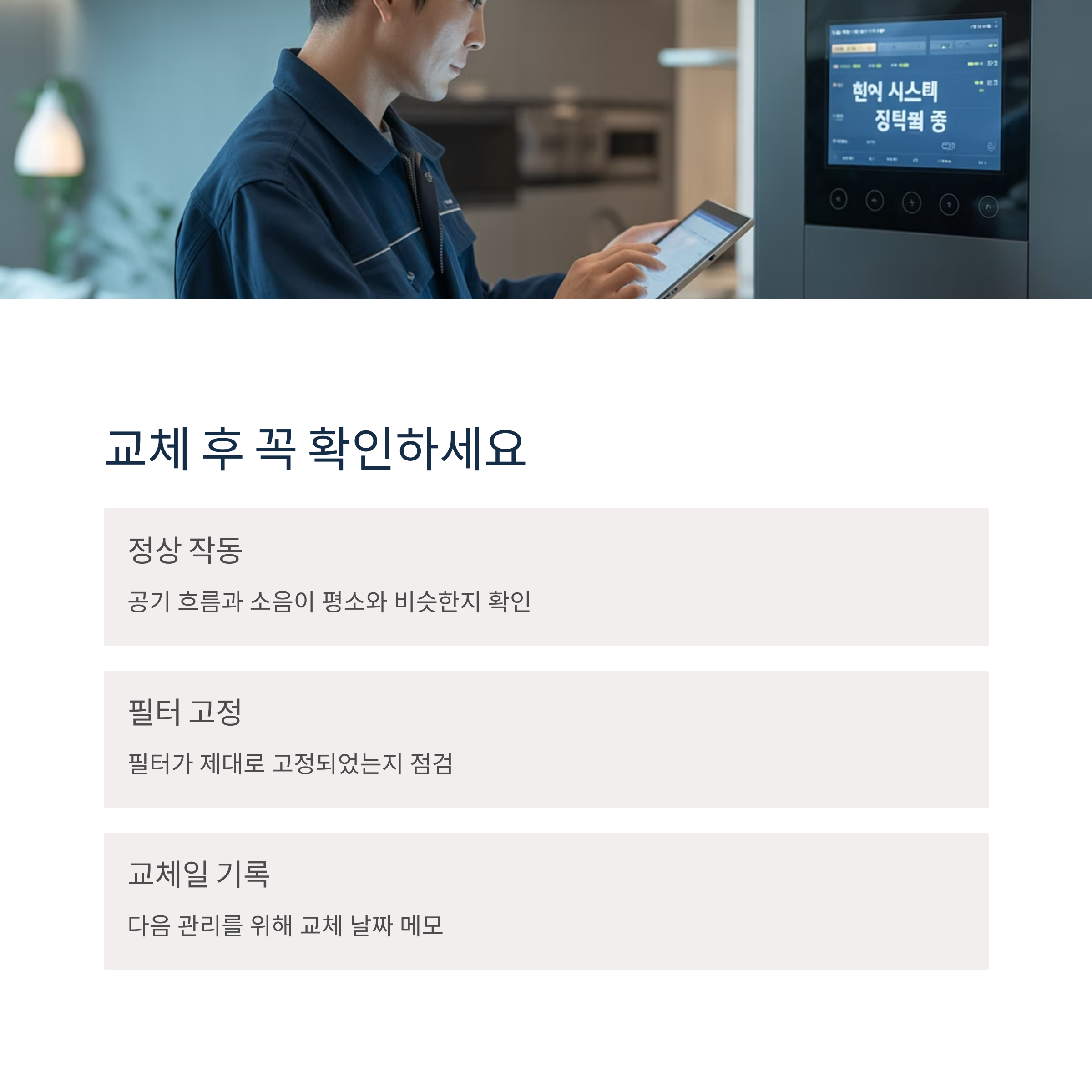 필터를 교체하고 난 후에는 환기장치가 정상 작동하는지 확인하세요.