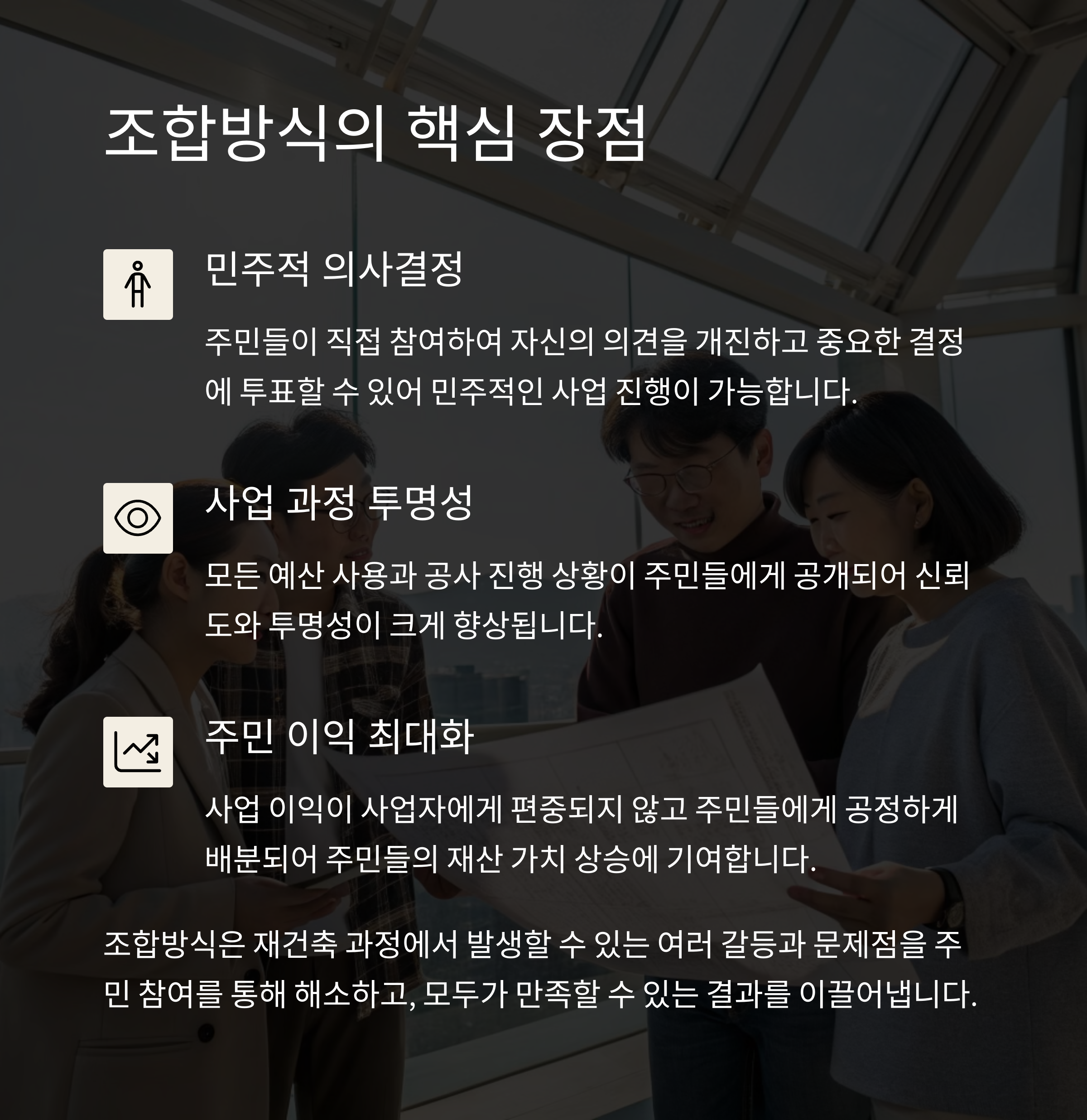 | 사업자 주도 형태로 진행 | 주민 참여가 가능한 방식 | 주민 권리 보장 및 투명성 강화 |
