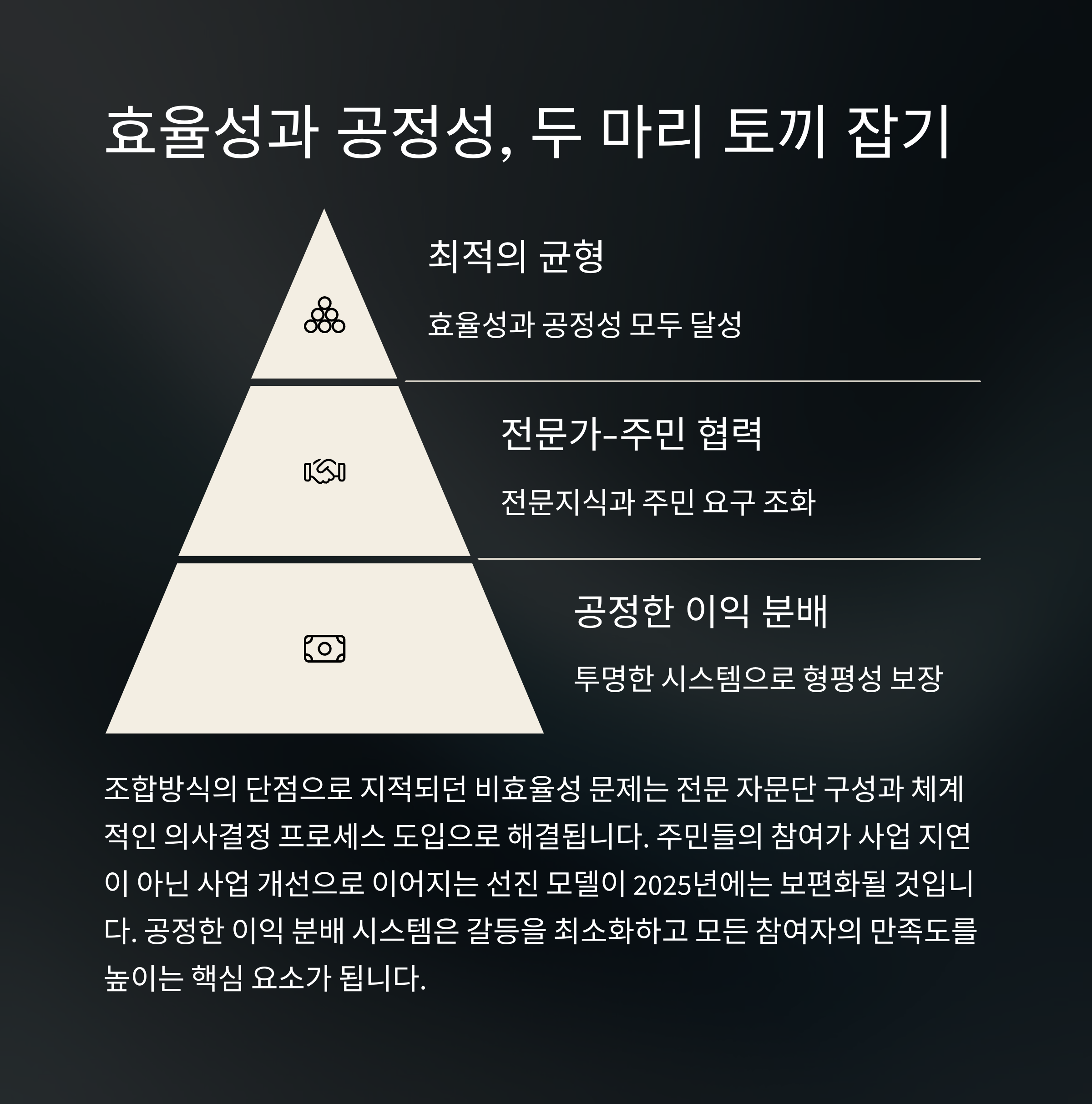 | 효율적 자금 조달 | 주민 의사결정 반영 가능 | 조합방식 확대에 따른 변화 |