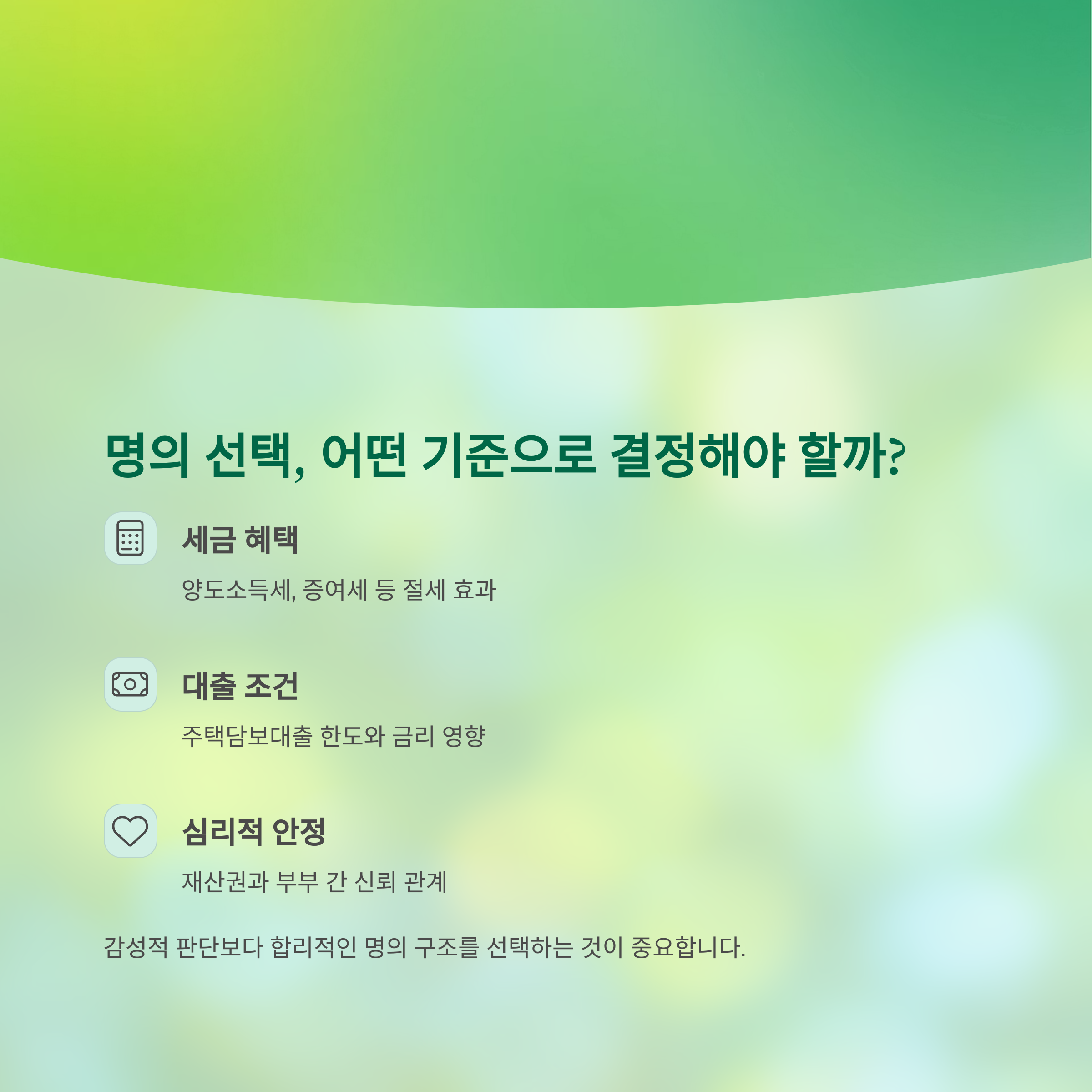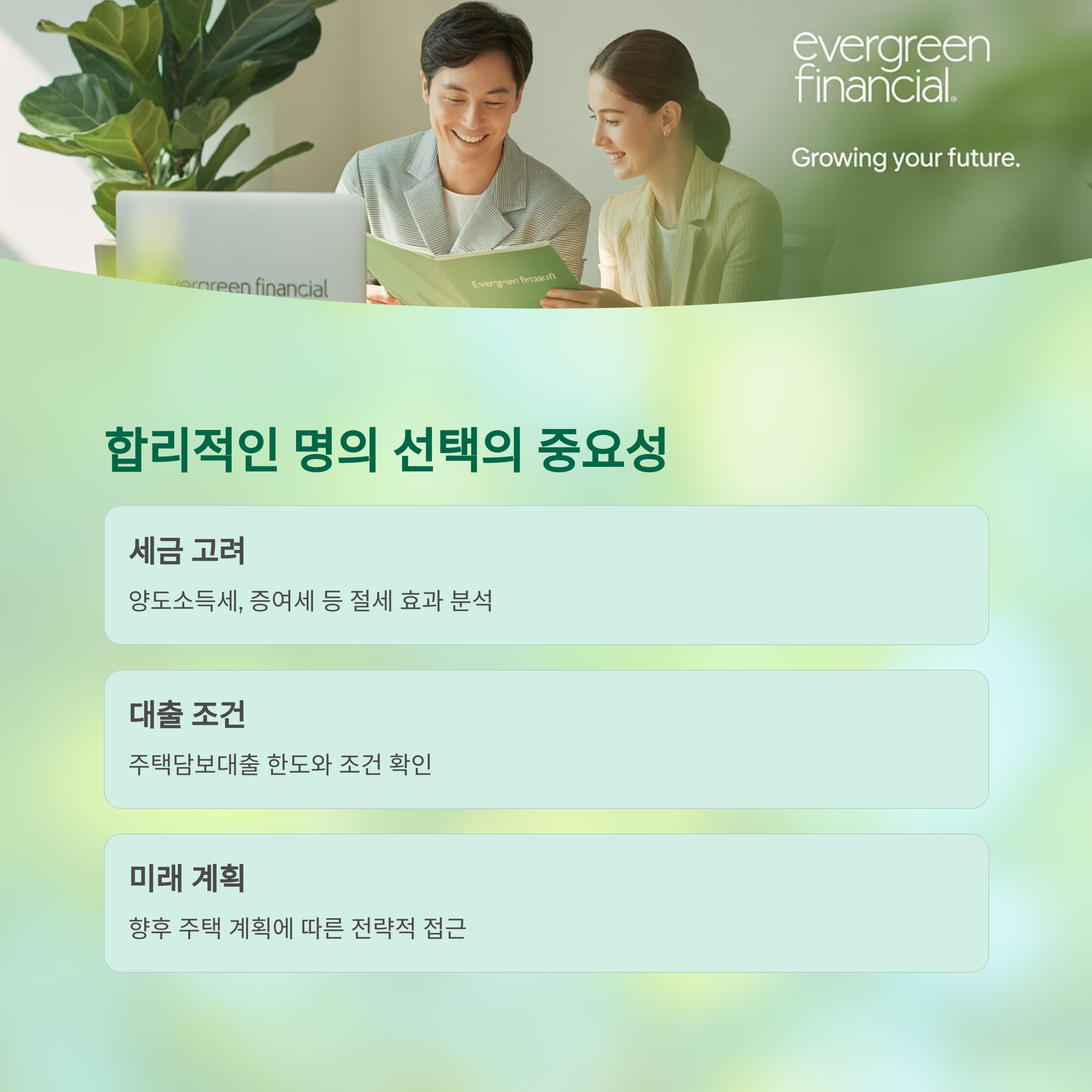세금, 대출, 보유 혜택, 심리적 안정 등 다양한 요소를 고려해 합리적인 명의 구조를 선택하는 것이 중요합니다.