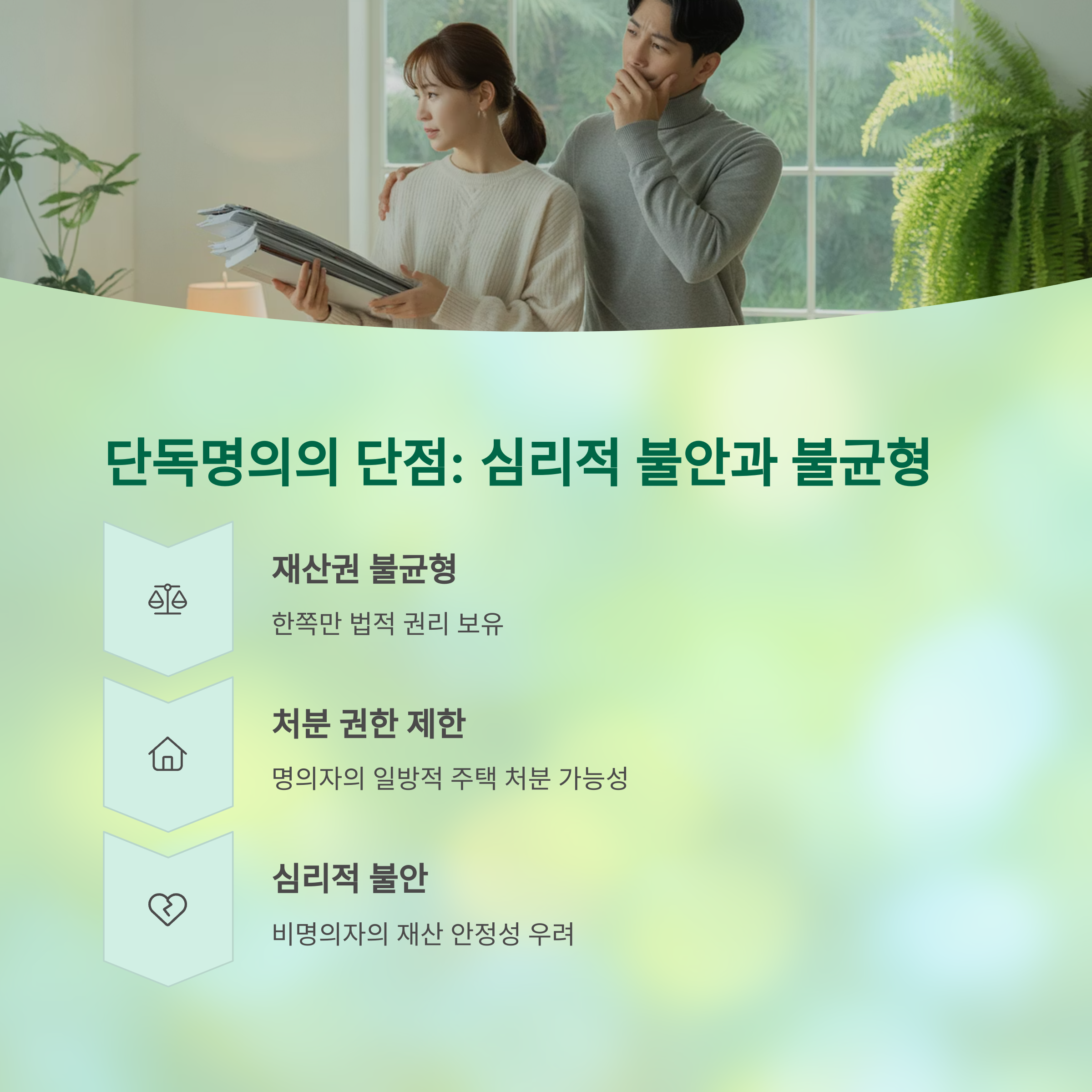 즉, 법적·심리적 불균형이 단독명의의 가장 큰 단점으로 작용할 수 있습니다.