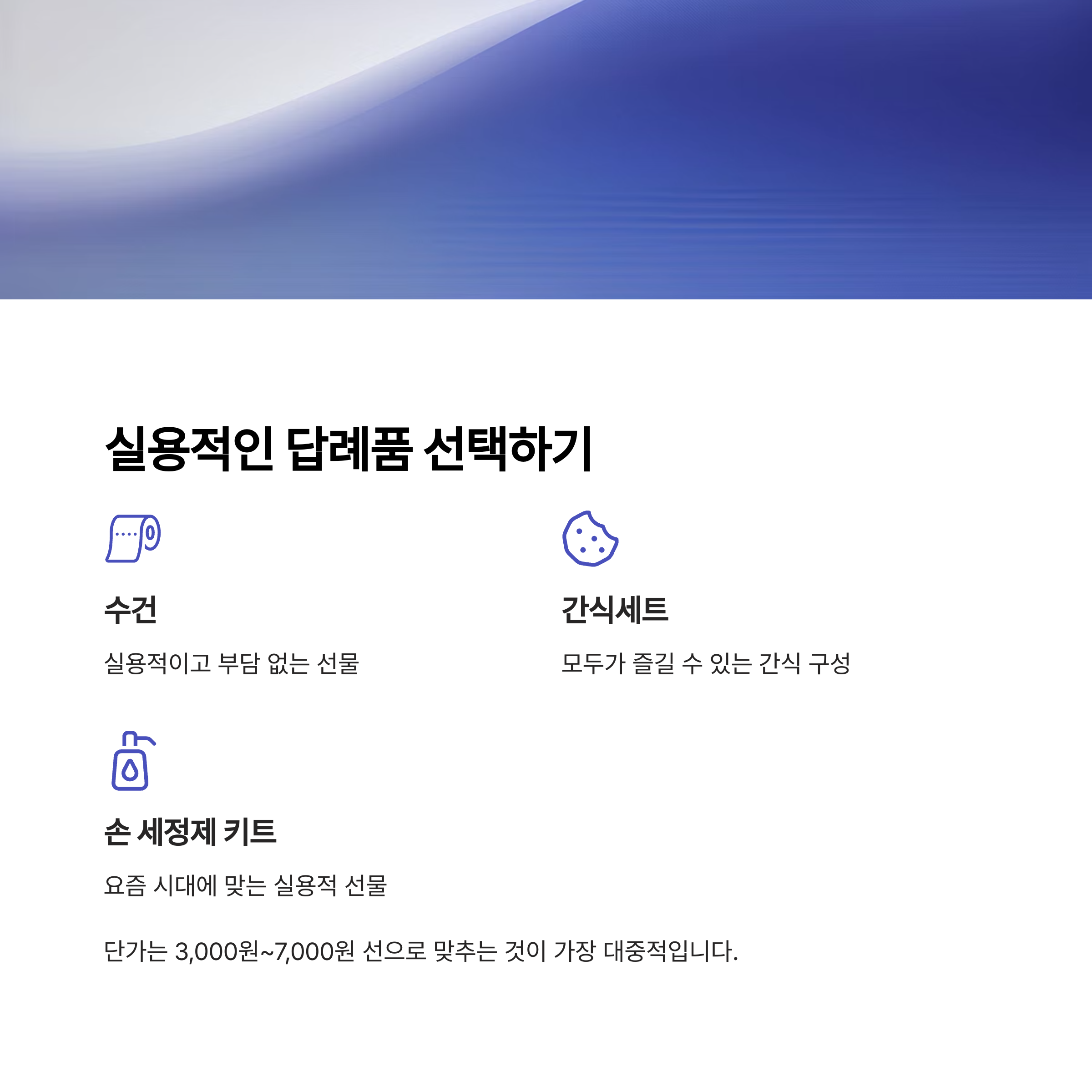 수건, 간식세트, 손 세정제 키트 등 실용적인 선택이 환영받습니다.