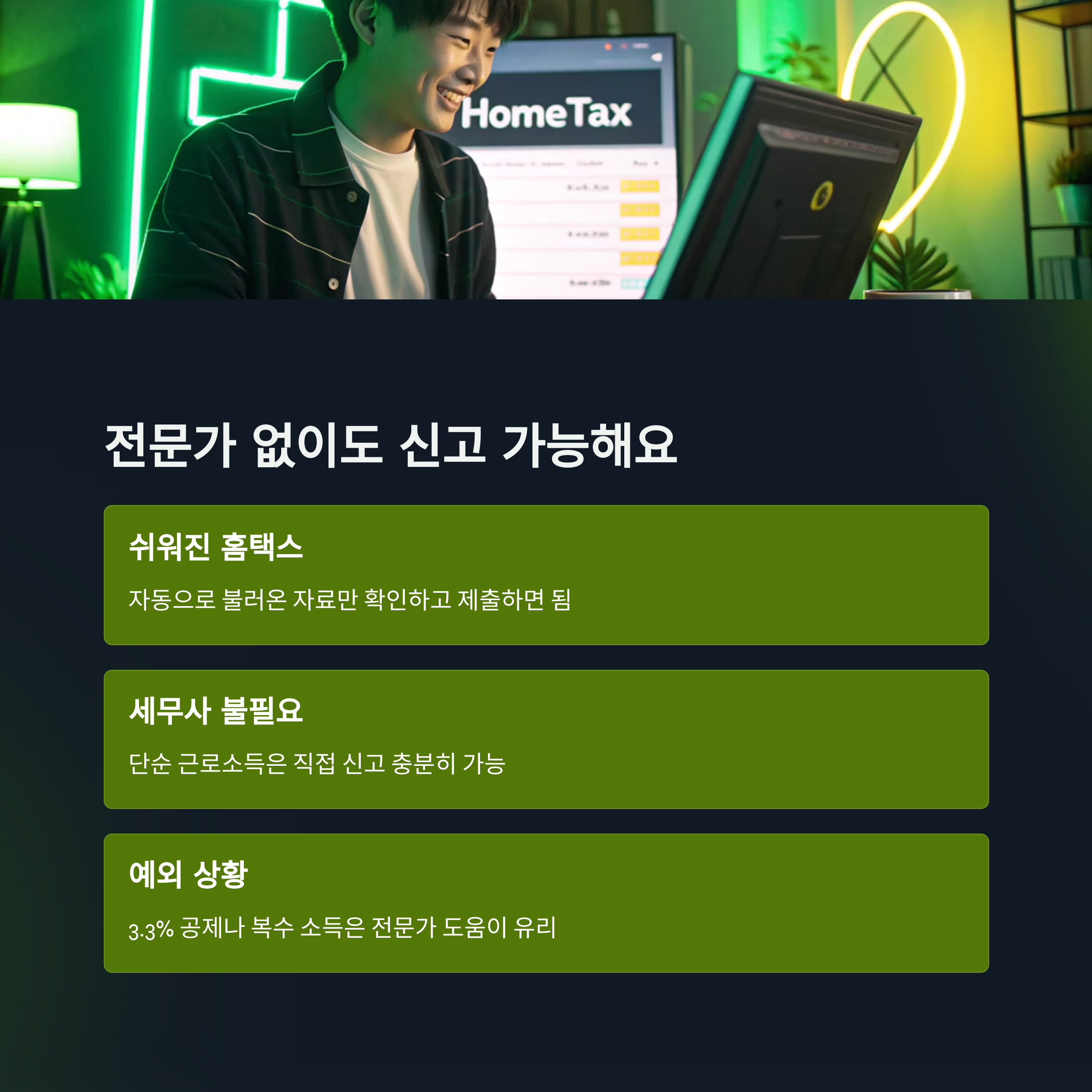 다만, 3.3% 공제 대상자나 복수 소득이 있는 경우에는 전문가의 도움을 받는 것이 유리할 수 있습니다.