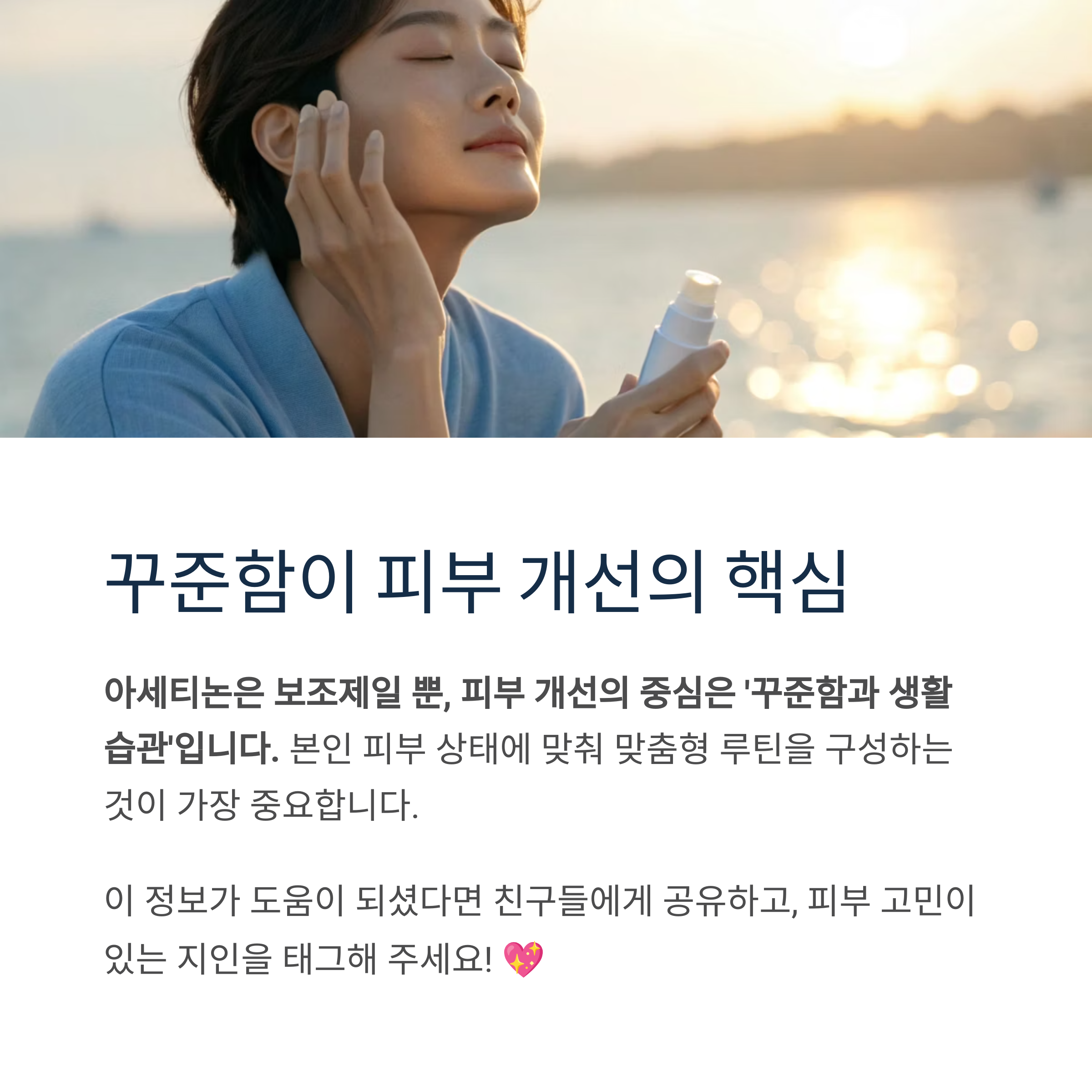 아세티논은 보조제일 뿐, 피부 개선의 중심은 ‘꾸준함과 생활 습관’입니다.