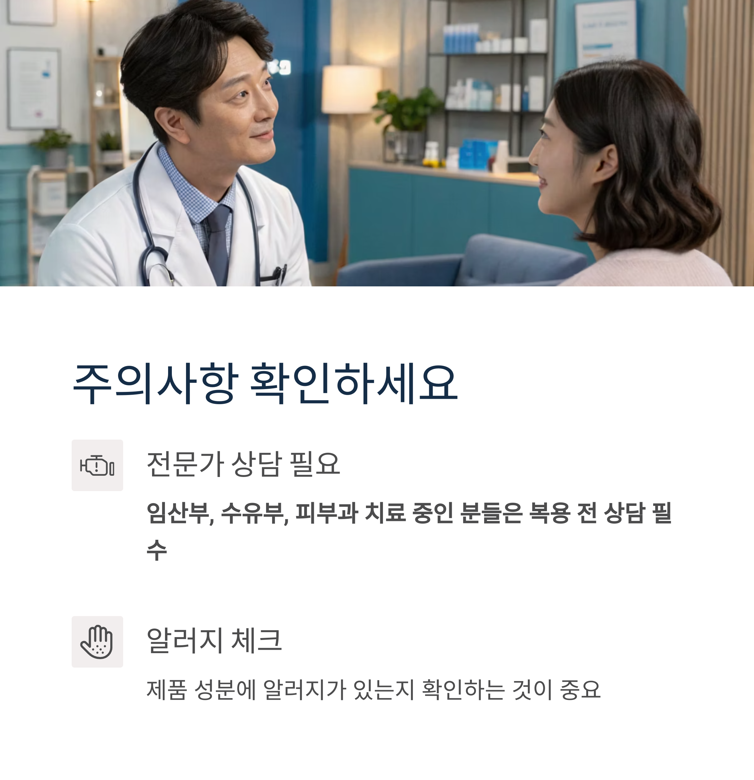 임산부, 수유부, 피부과 치료 중인 분들은 복용 전 전문가 상담이 필요합니다.