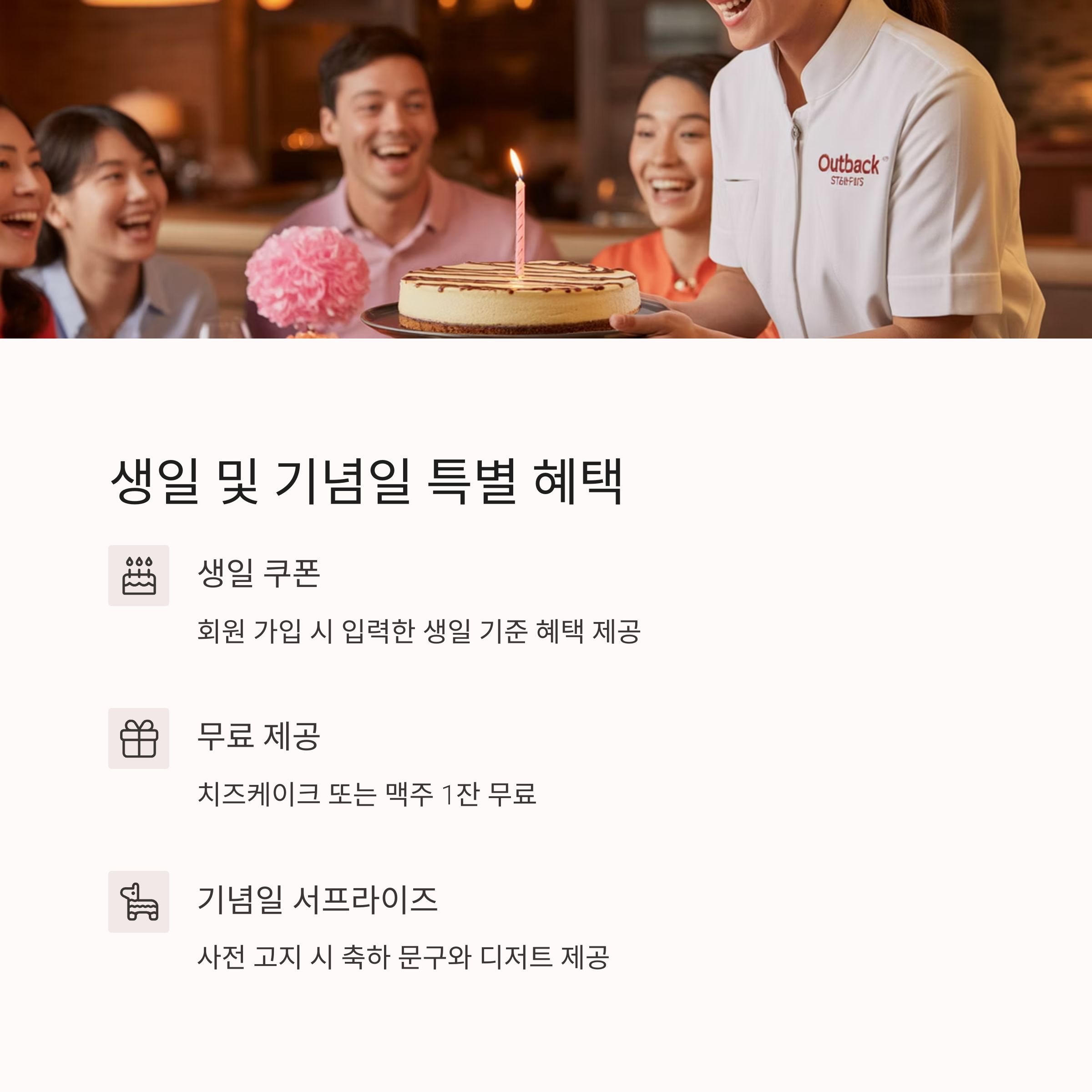 아웃백 회원 가입 시 입력한 생일에 맞춰 생일 쿠폰 또는 무료 메뉴가 제공됩니다