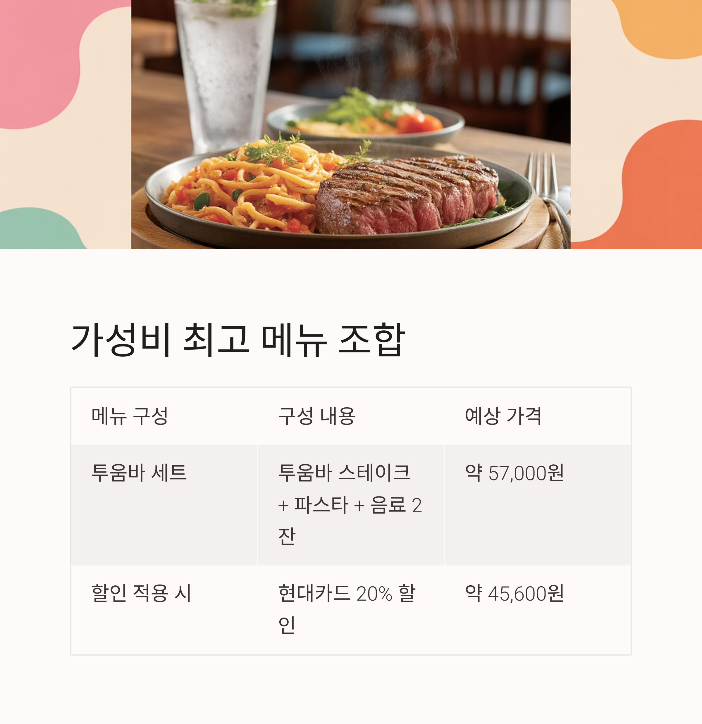 | 투움바 세트 | 투움바 스테이크 + 투움바 파스타 + 음료 2잔 | 약 57,000원 |