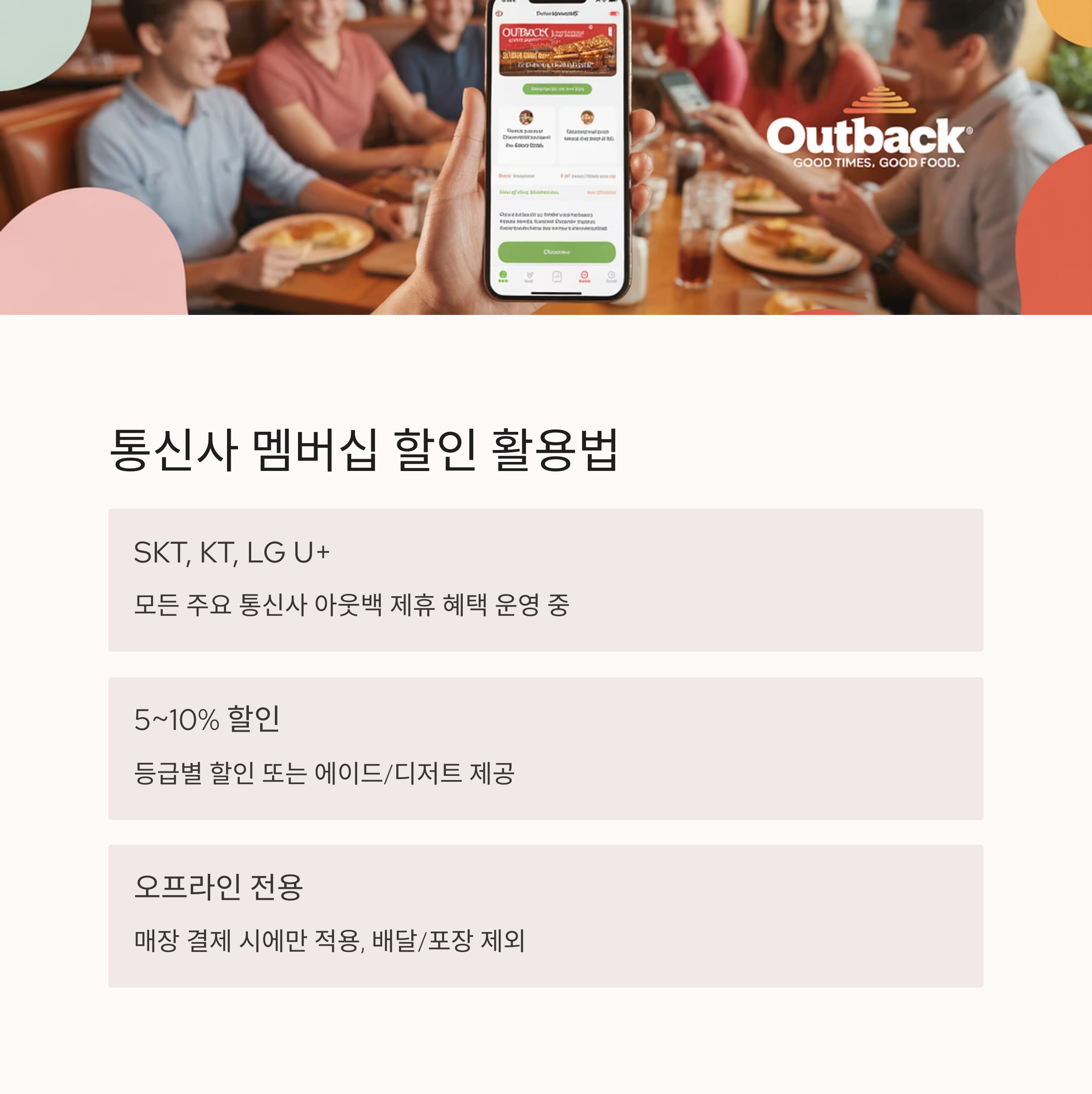 통신사 멤버십 중 SKT, KT, LG U+ 모두 아웃백 제휴 혜택을 운영하고 있습니다