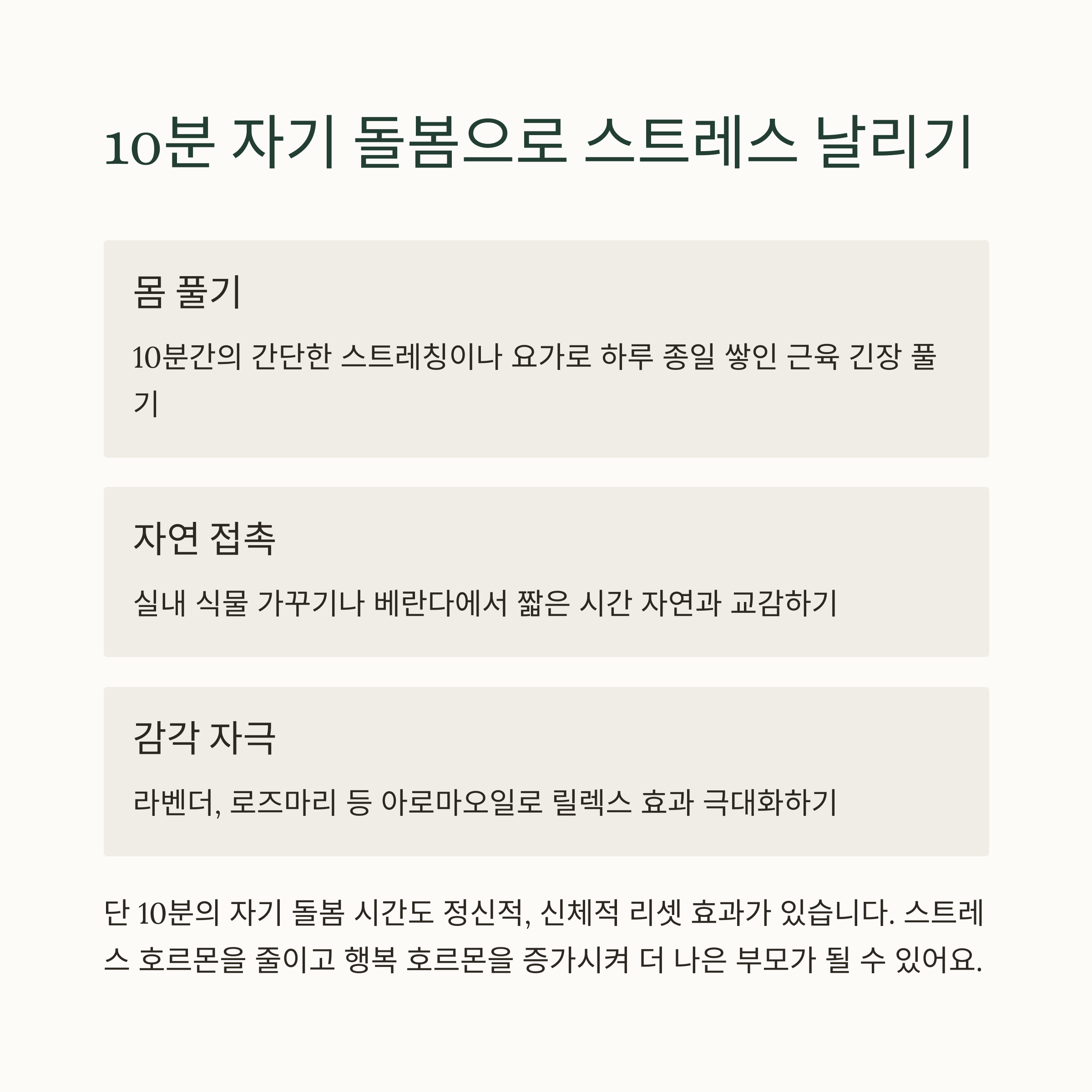 | 휴식 시간은 육체적 뿐만 아니라 정신적 건강에도 필수적입니다. 자기 돌봄은 지속 가능한 에너지 관리의 시작점입니다. 스트레칭이나 명상은 과도한 육체적, 정신적 긴장을 완화해줍니다. 심리적 안정은 다음날의 집중력과 긍정적인 마인드로 이어지게 합니다. 휴식과 힐링을 소홀히 하지 않을 경우, 장기적인 육아 피로를 예방할 수 있습니다. |