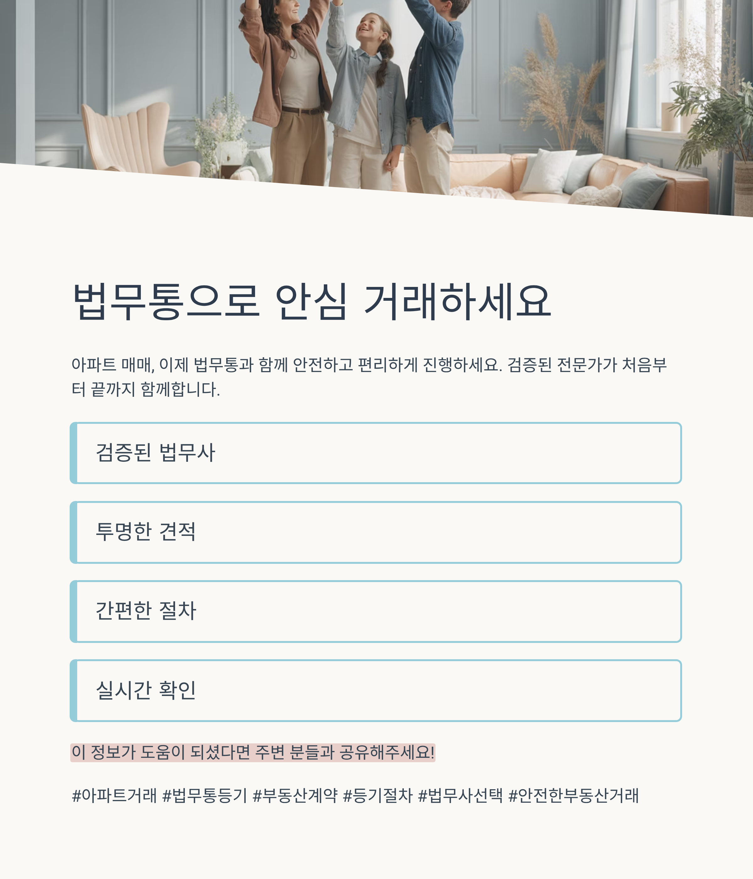 아파트를 사고팔 때는 수천만 원에서 수억 원이 오가는 큰 거래이기 때문에, 실수 하나가 큰 손해로 이어질 수 있습니다. 그래서 요즘 많은 사람들이 법무사를 통해 안전하게 등기를 진행하고 있는데요. 그중에서도 '법무통'을 이용하면 어떤 점이 좋은지, 실제로 왜 많은 이들이 선택하는지 이유를 정리해봤습니다.