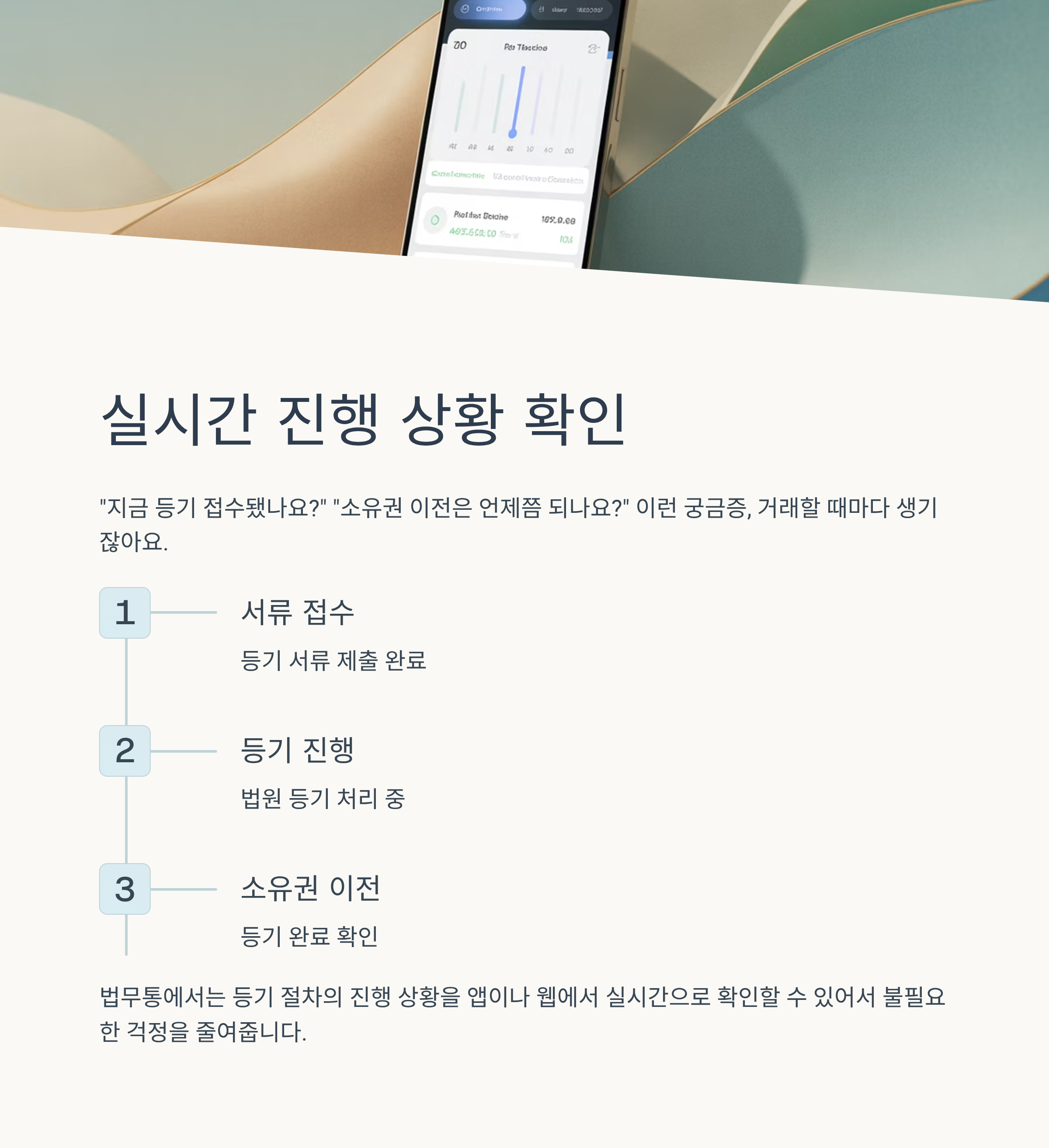 법무통에서는 등기 절차의 진행 상황을 앱이나 웹에서 실시간으로 확인할 수 있어서