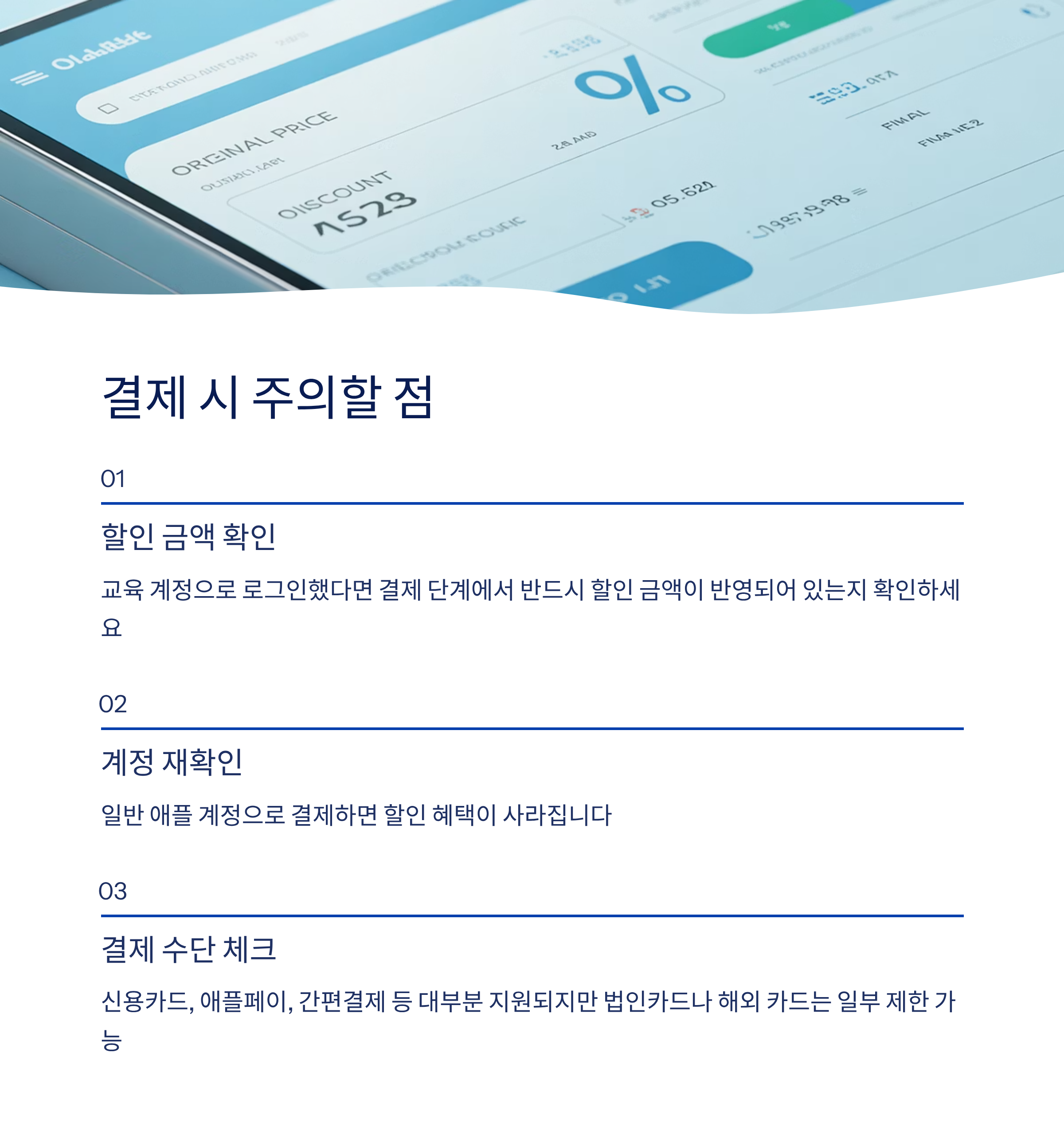 교육 계정으로 로그인했다면 결제 단계에서도 반드시 할인 금액이 반영되어 있는지 확인하세요.