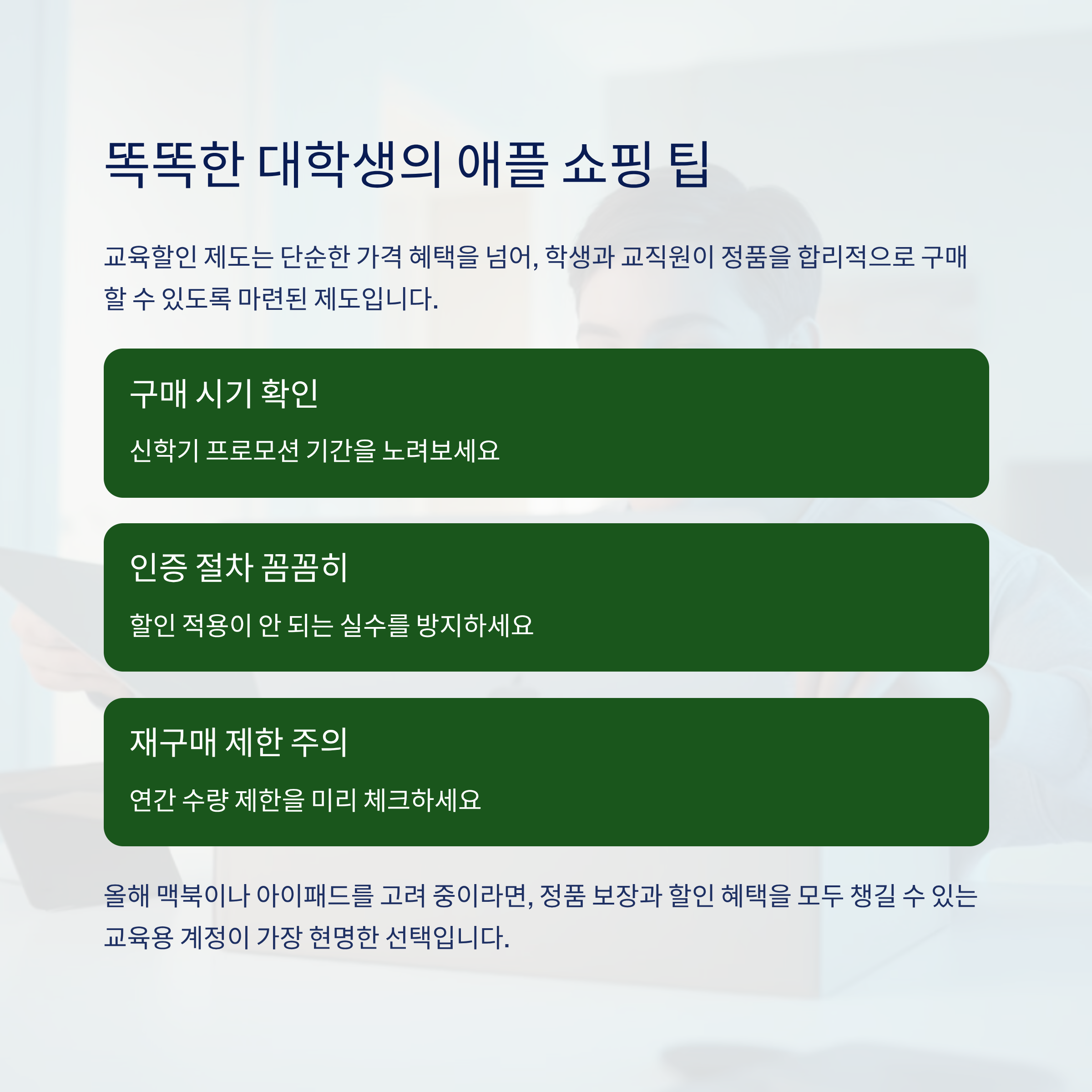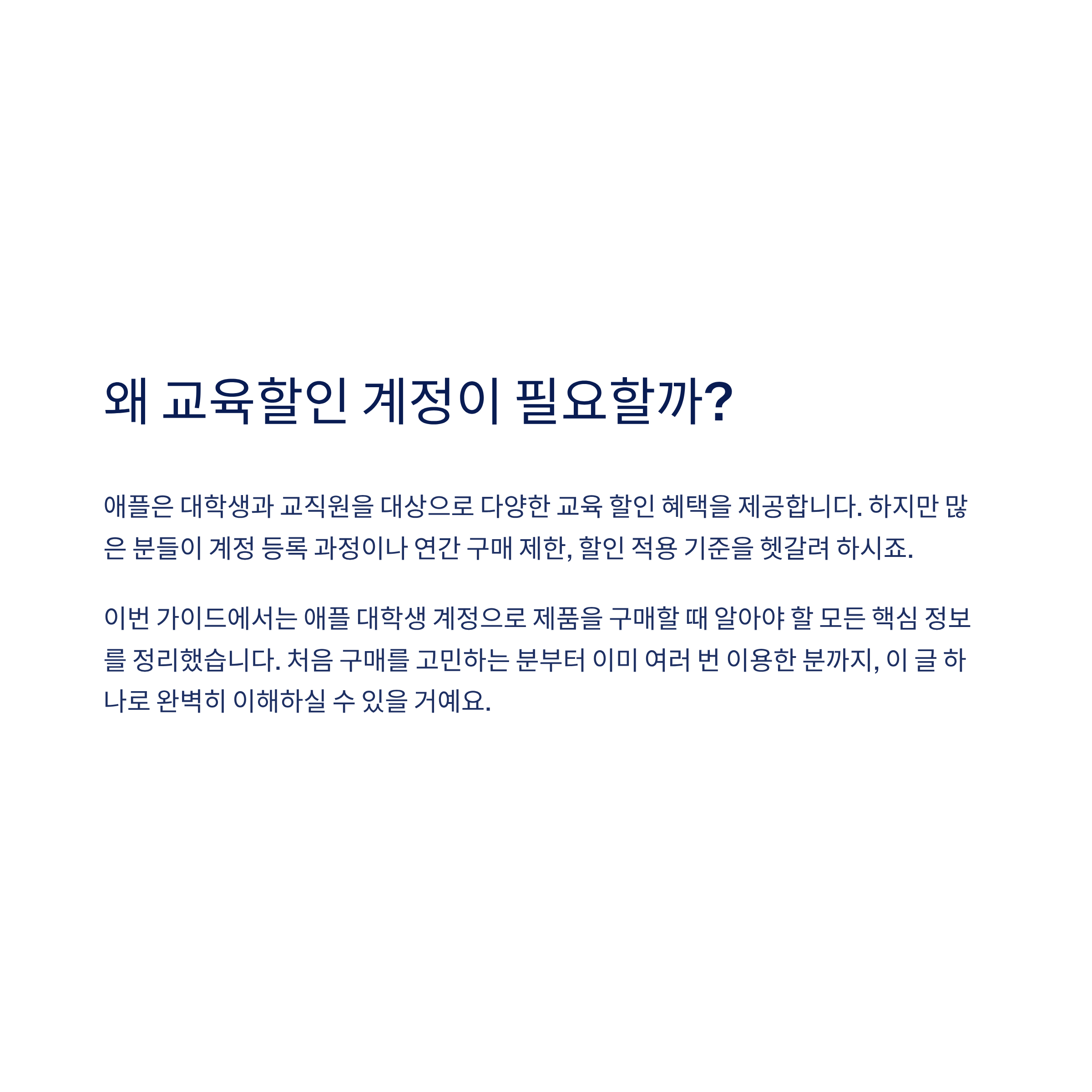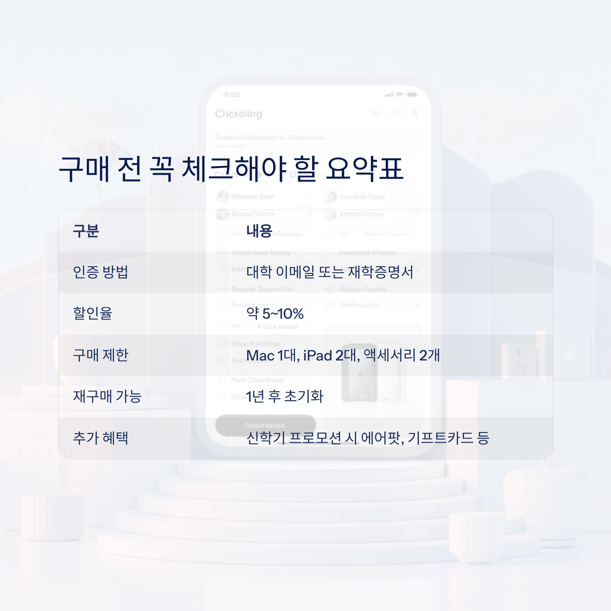 애플은 대학생과 교직원을 대상으로 다양한 교육 할인 혜택을 제공합니다. 하지만 많은 분들이 계정 등록 과정이나 연간 구매 제한, 할인 적용 기준을 헷갈려 하시죠. 이번 글에서는 애플 대학생 계정으로 제품을 구매할 때 알아야 할 모든 핵심 정보를 정리했습니다. 처음 구매를 고민하는 분부터 이미 여러 번 이용한 분까지, 이 글 하나로 완벽히 이해하실 수 있을 거예요.