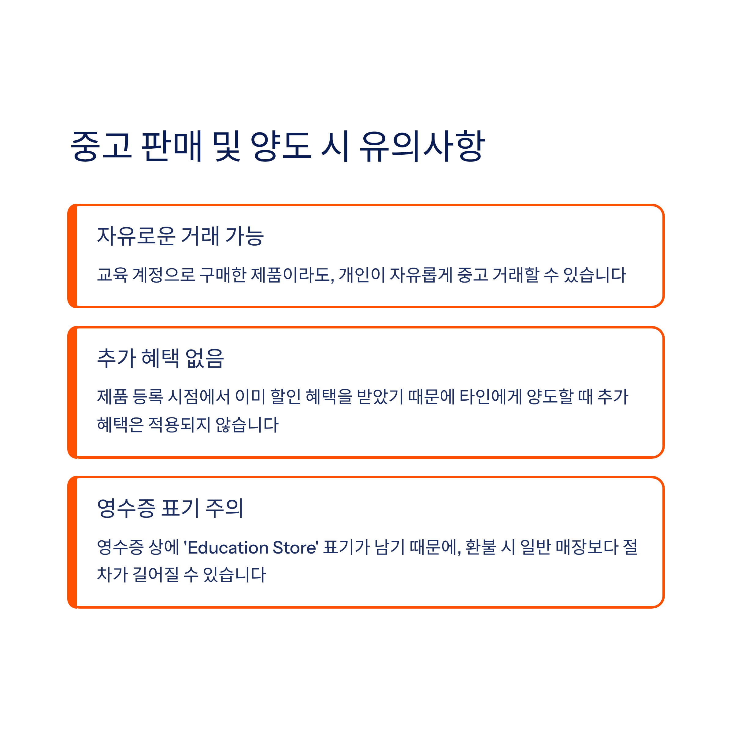 교육 계정으로 구매한 제품이라도, 개인이 자유롭게 중고 거래할 수 있습니다.