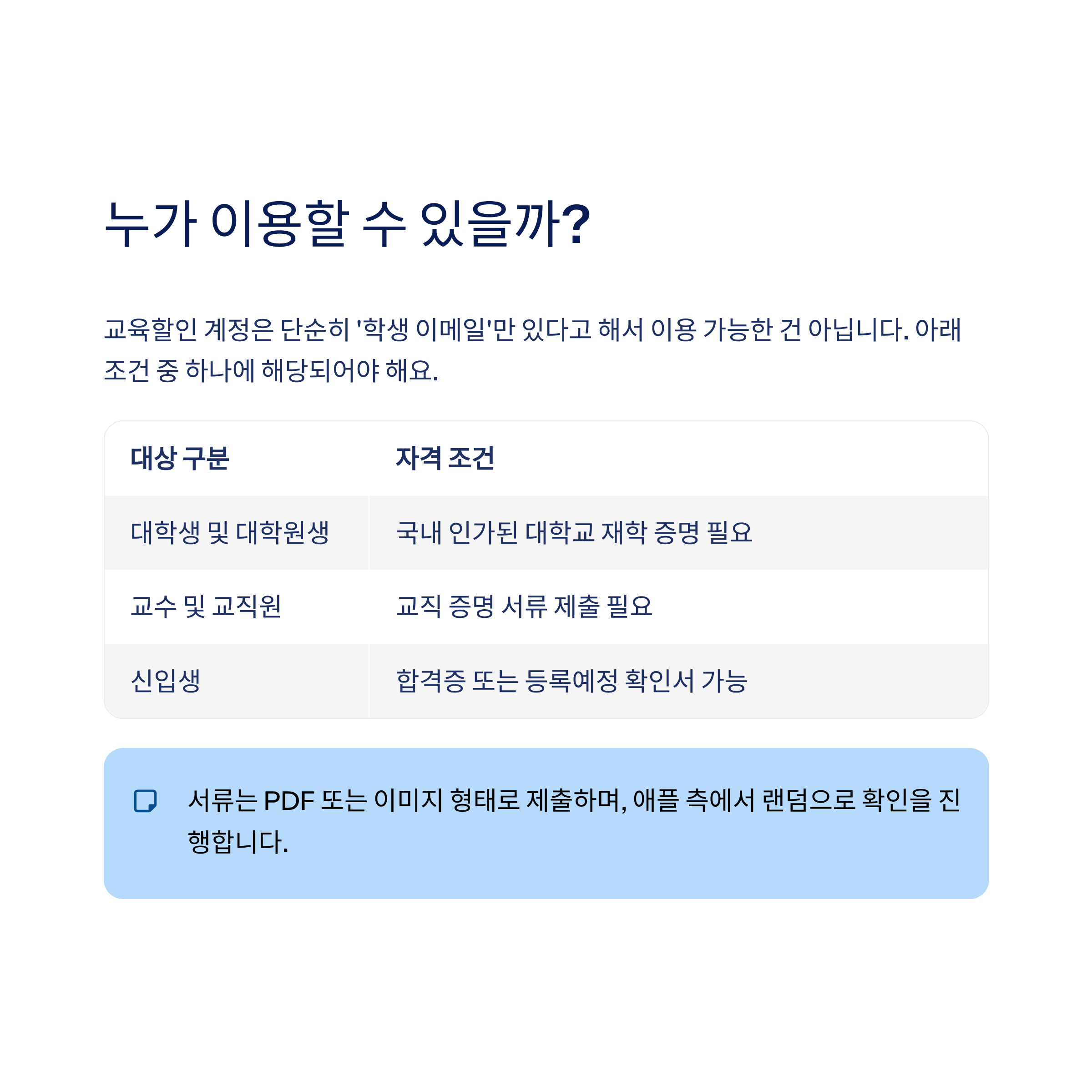 교육할인 계정은 단순히 ‘학생 이메일’만 있다고 해서 이용 가능한 건 아닙니다. 아래 조건 중 하나에 해당되어야 해요.