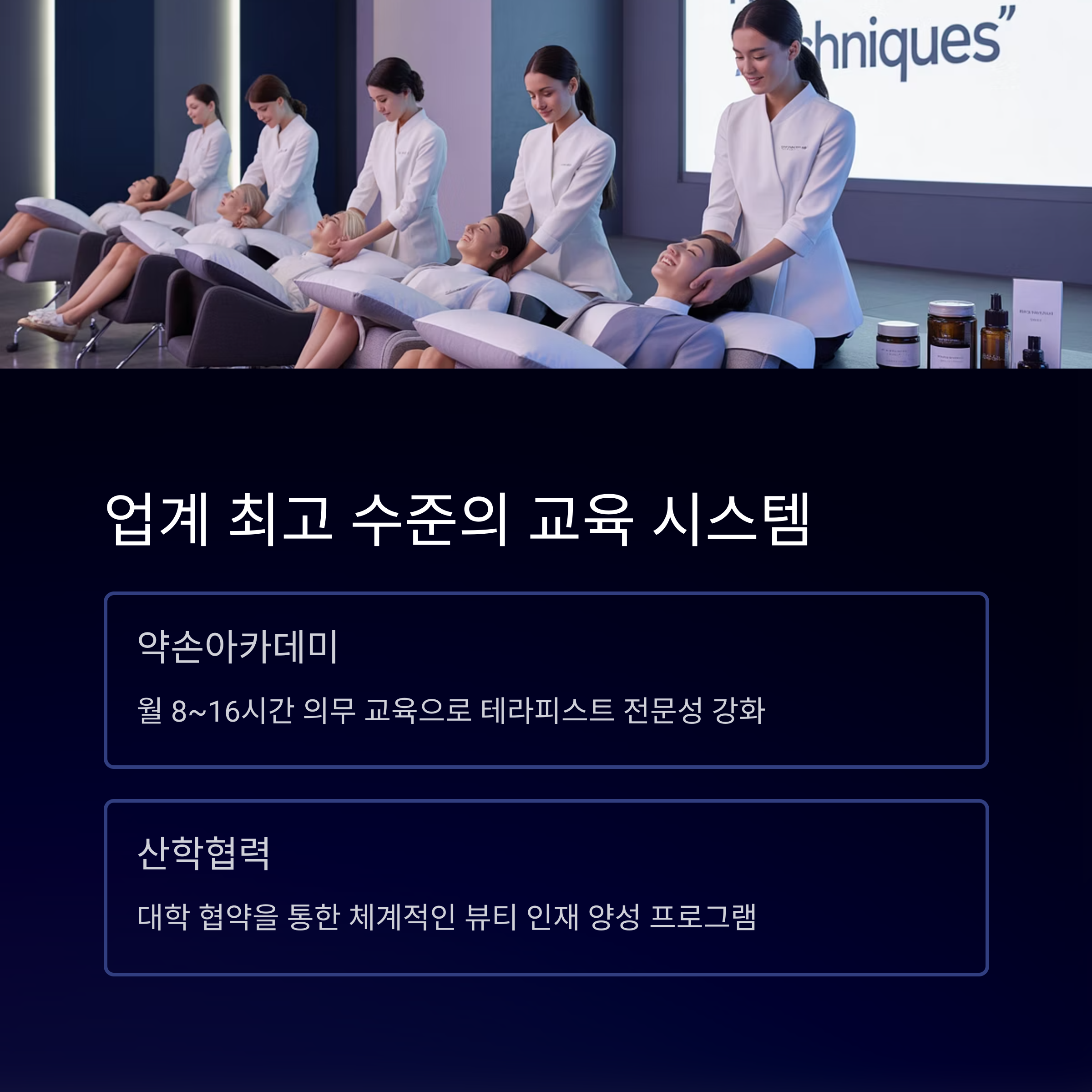 집중하고 있어 뷰티업계 내에서 교육 시스템의 모범 사례로 평가받고 있습니다.