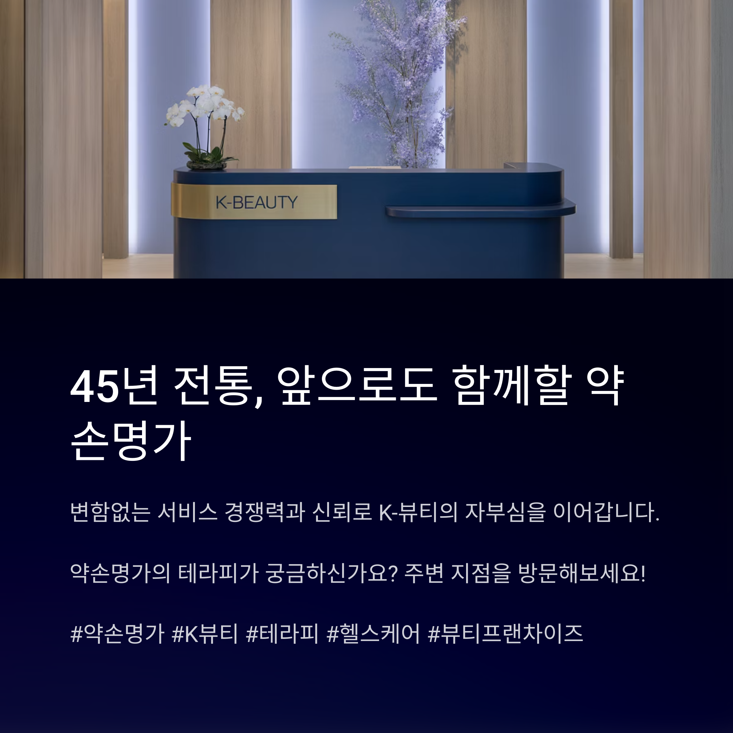 약손명가는 1979년 창립 이후 국내 뷰티·헬스케어 산업의 기틀을 마련한 중소기업으로, 수기 테라피를 통한 체형관리와 피부관리 분야에서 독자적인 입지를 다지고 있는 브랜드입니다. 현재 전국 150여 개 지점을 운영 중이며, 꾸준한 프랜차이즈 확장을 통해 해외 시장까지 진출하며 K-뷰티의 위상을 넓히고 있습니다. 최근엔 헬스케어 제품 및 플랫폼 개발을 강화하며 사업 영역을 확대해 나가고 있습니다.