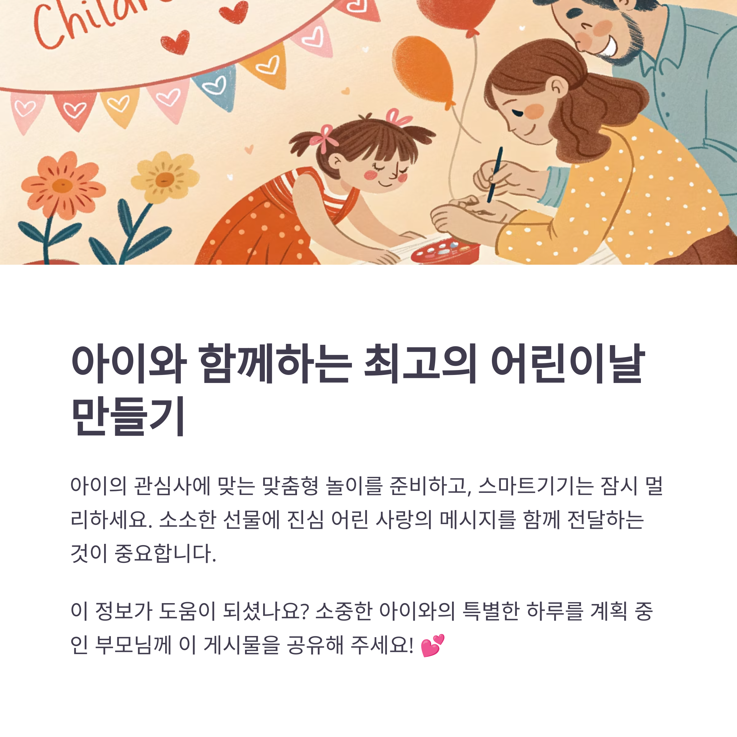 어린이날은 그 유대감을 자연스럽게 깊게 만들 수 있는 절호의 기회입니다.