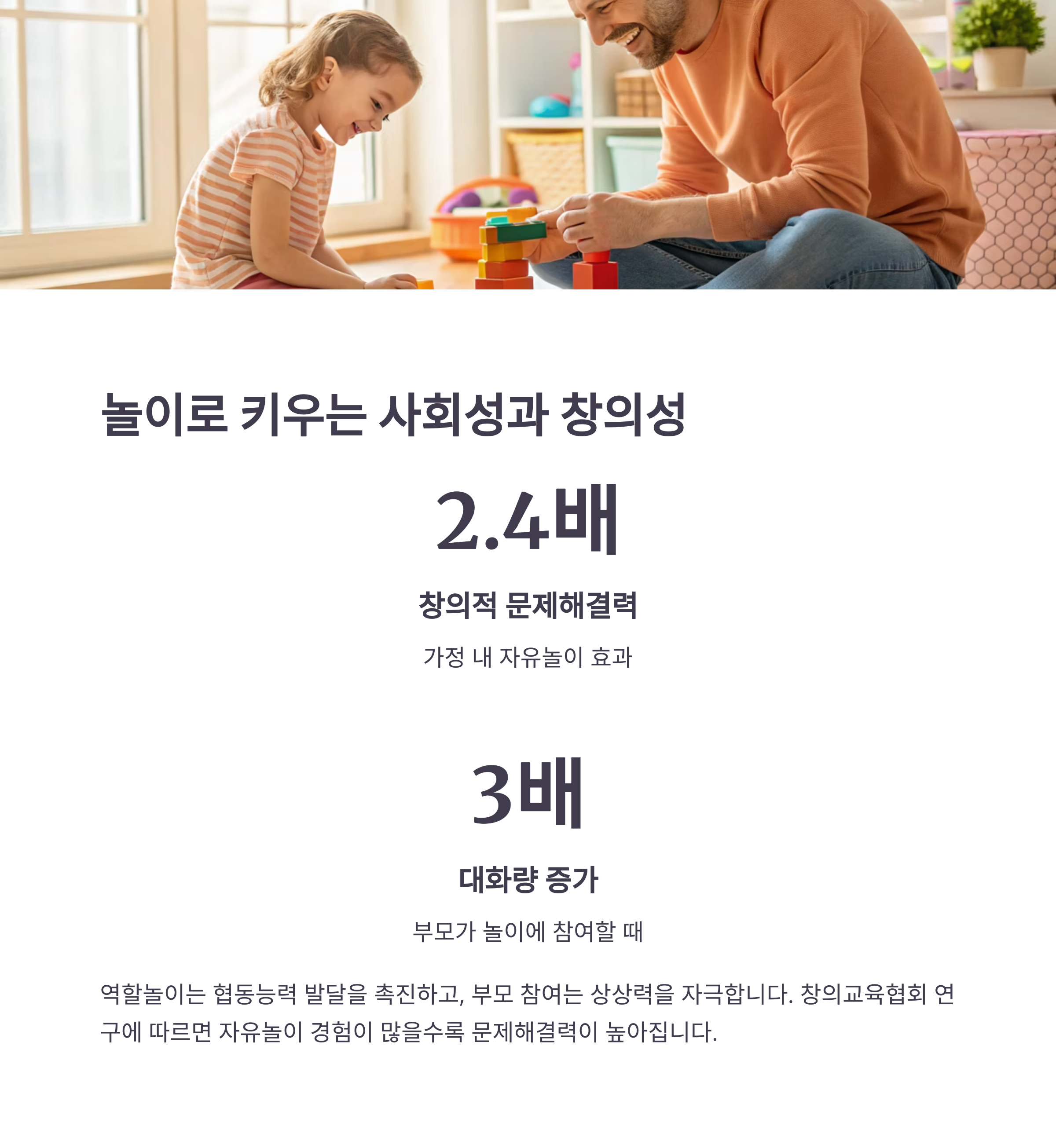 역할놀이, 블록쌓기, 그림그리기 같은 단순한 활동도 유아의 사회성과 창의성을 폭발적으로 키웁니다.