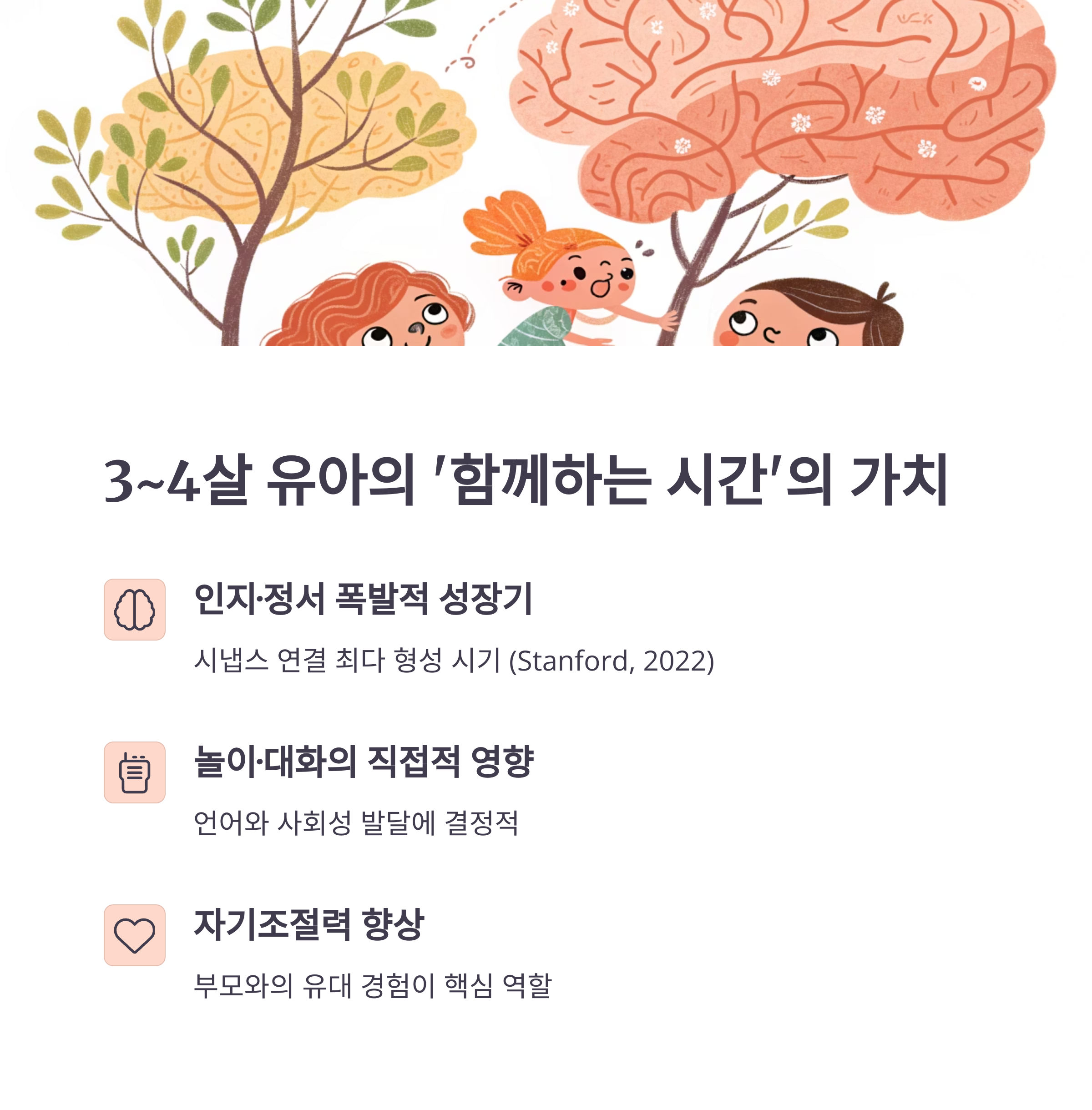 특히 3~4살 유아는 물질보다 감정에 민감하기 때문에, 함께 보내는 시간이 무엇보다 소중합니다.