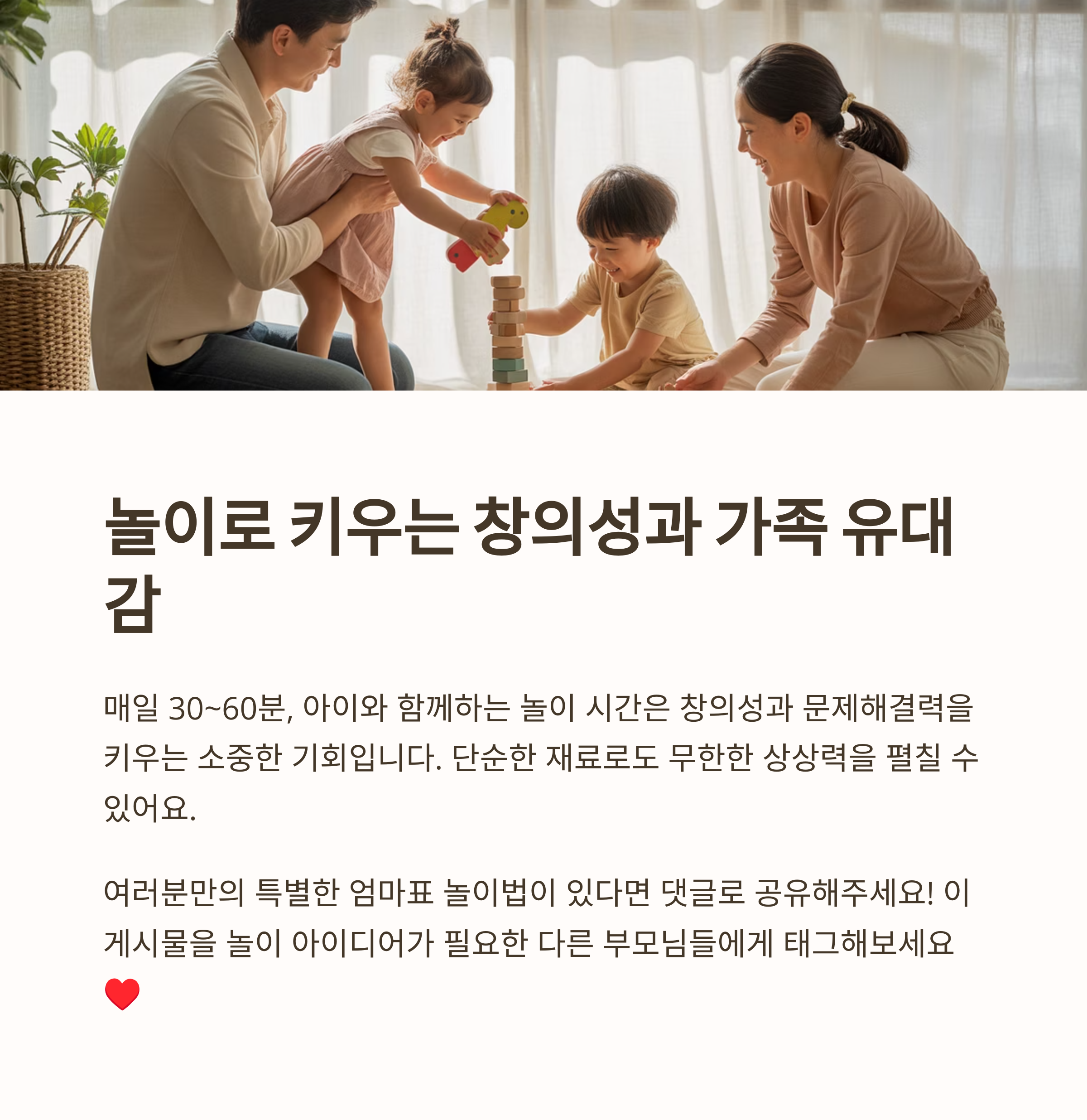 아이와 함께 시간을 보내며 성장 지원뿐 아니라 행복한 추억을 만들 수 있습니다. 한 번의 시도로 끝내지 말고 다양한 재료를 활용해 지속적으로 아이와 창작해보세요.