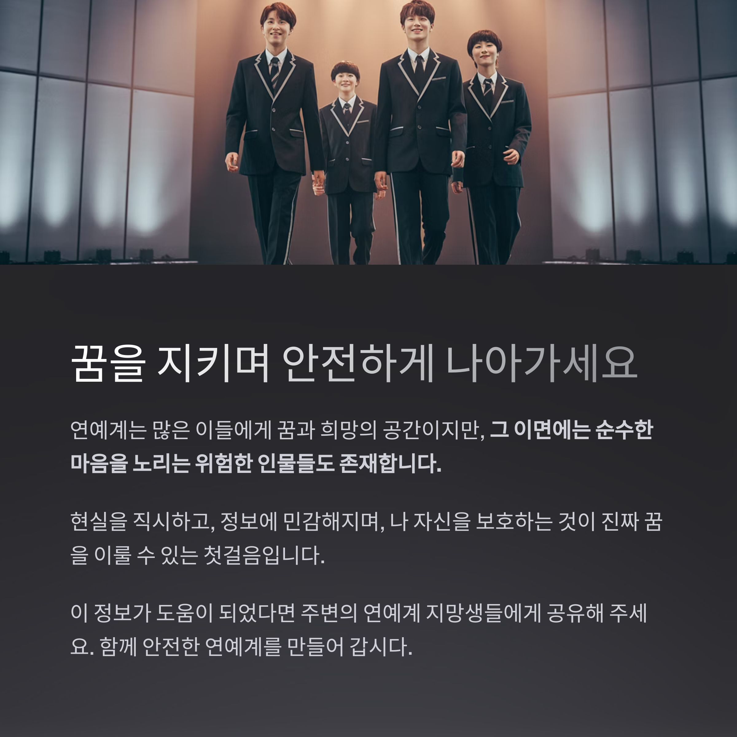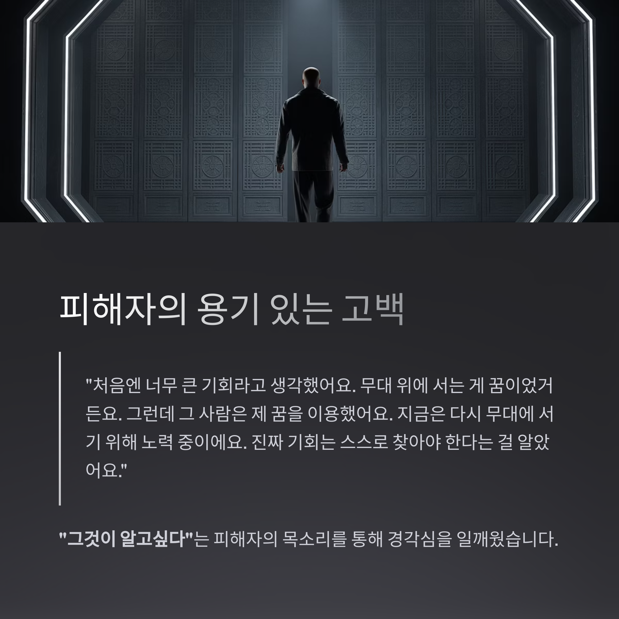 "처음엔 너무 큰 기회라고 생각했어요. 무대 위에 서는 게 꿈이었거든요. 그런데 그 사람은 제 꿈을 이용했어요. 지금은 다시 무대에 서기 위해 노력 중이에요. 진짜 기회는 스스로 찾아야 한다는 걸 알았어요."